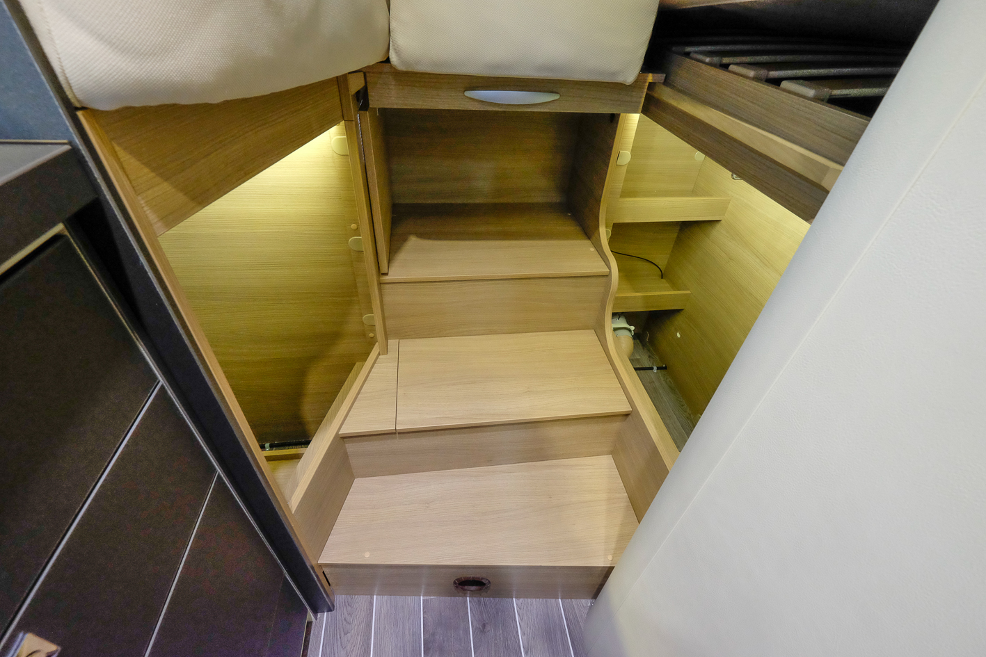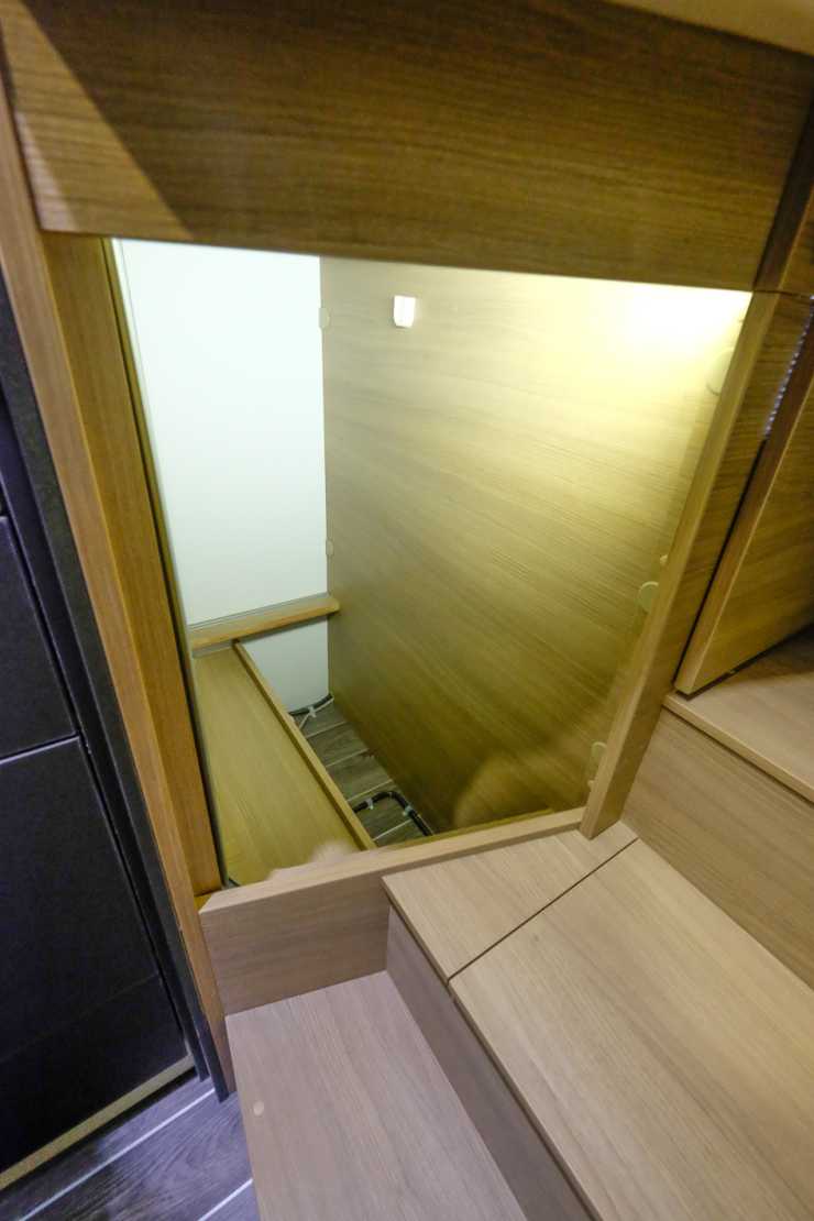 Alla utrymmen i trappan upp till sängen utnyttjas till förvaring.