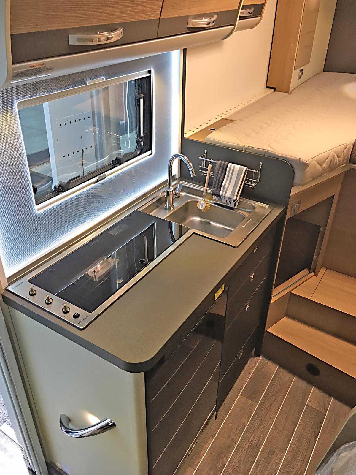 Köksmodulen är kompakt men har ändå arbetsutrymme framför de tre lågorna på rad. Liten kyl med frysfack under.