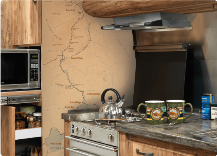 Det välutrustade köket inkluderar även en utdragbar mikro. I fonden en karta över nationalparken Yellowstone.