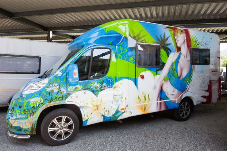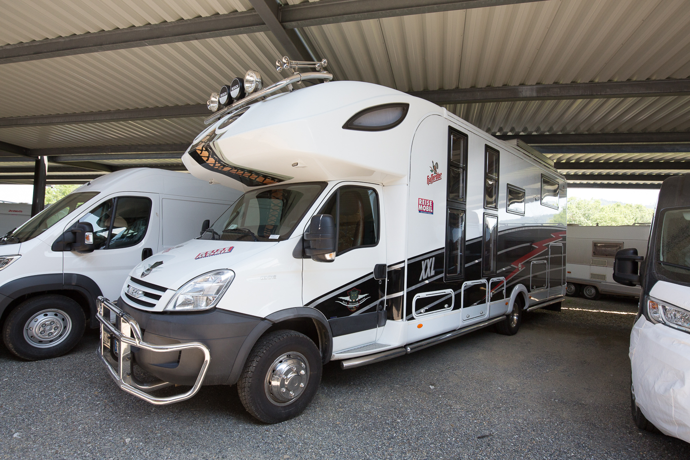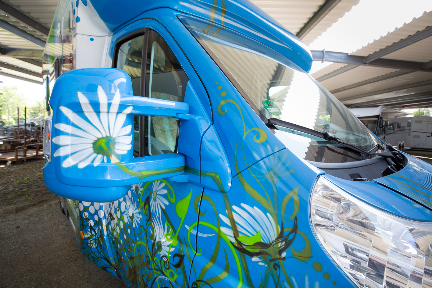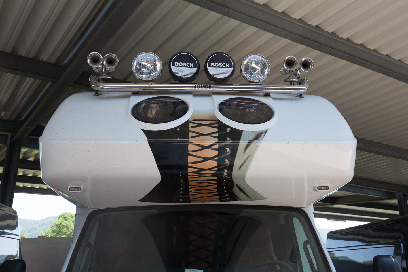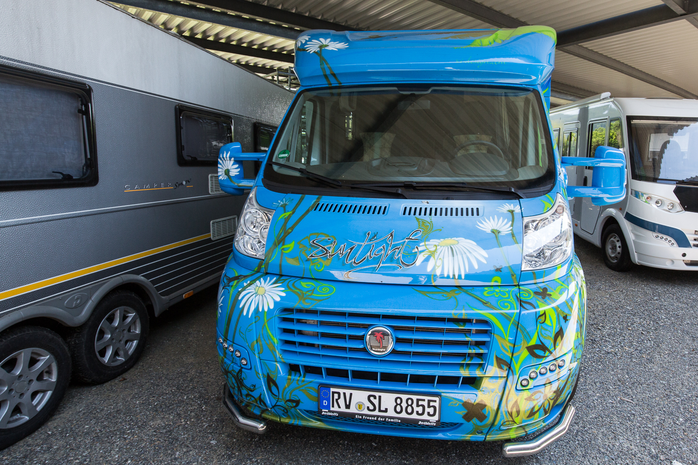 Den här bilen sticker ut från mängden. Den ska förmodligen bli en riktig husbil och väntar bara på sin tid i fabriken en bit bort.