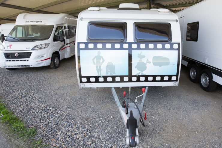 Det här är en rullande biosalong som vi bland annat sett på mässan i Stuttgart i år. Soffor, bioduk och liten barkyl invändigt.