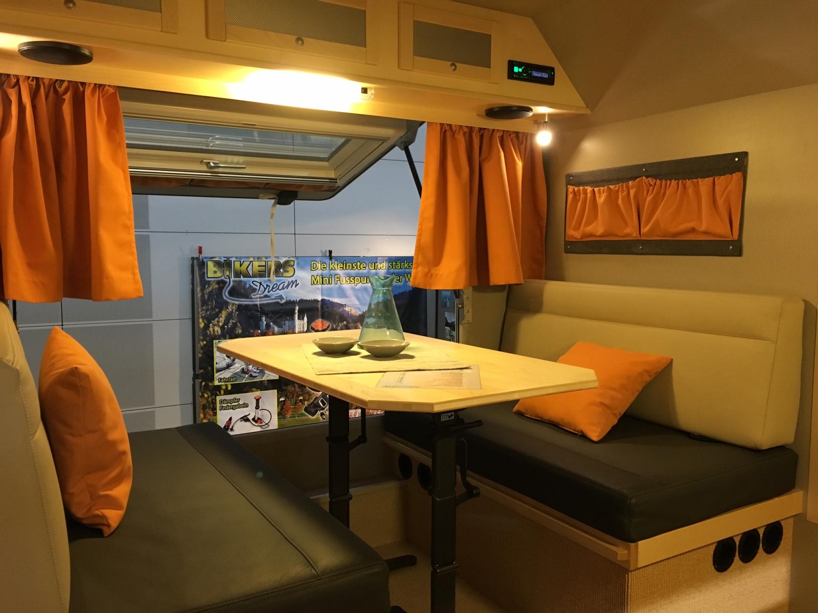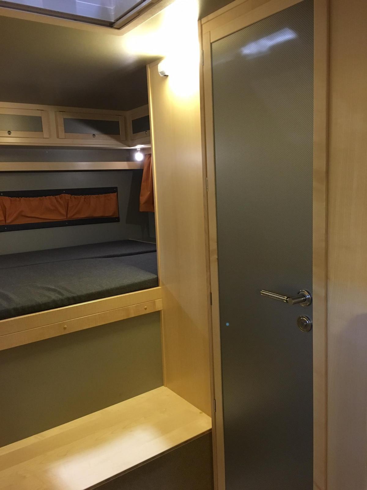 Dubbelsäng i bilens akter och under denna finns förvaringen nåbar utifrån.