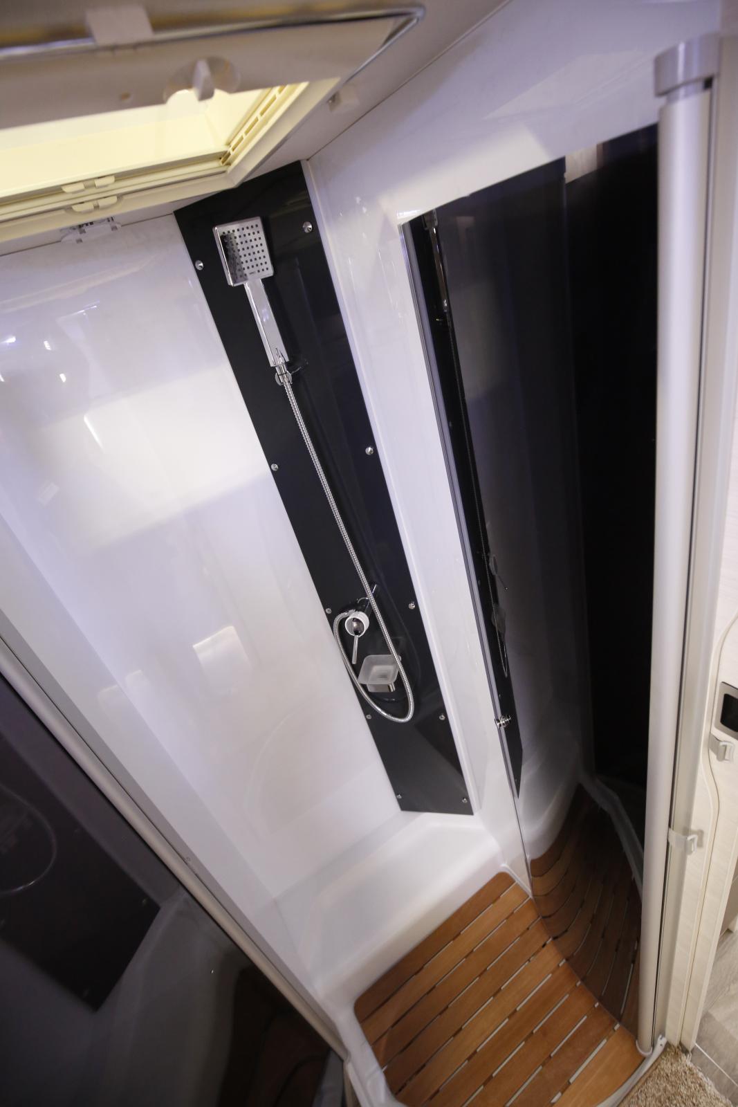 Chausson 718XLB. Svängbara dörrar till duschen och trätrall (tillbehör).