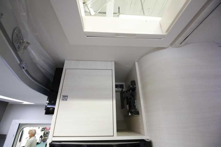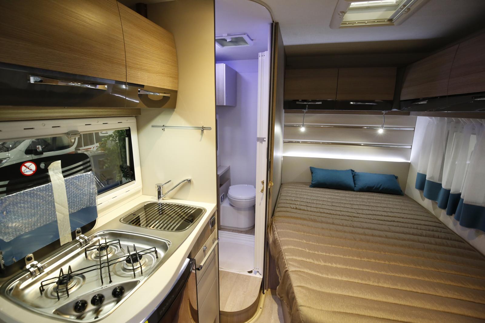 Chausson 515. Kök precis intill bodelsentrén och hygienutrymme mellan kök och den franska bädden.