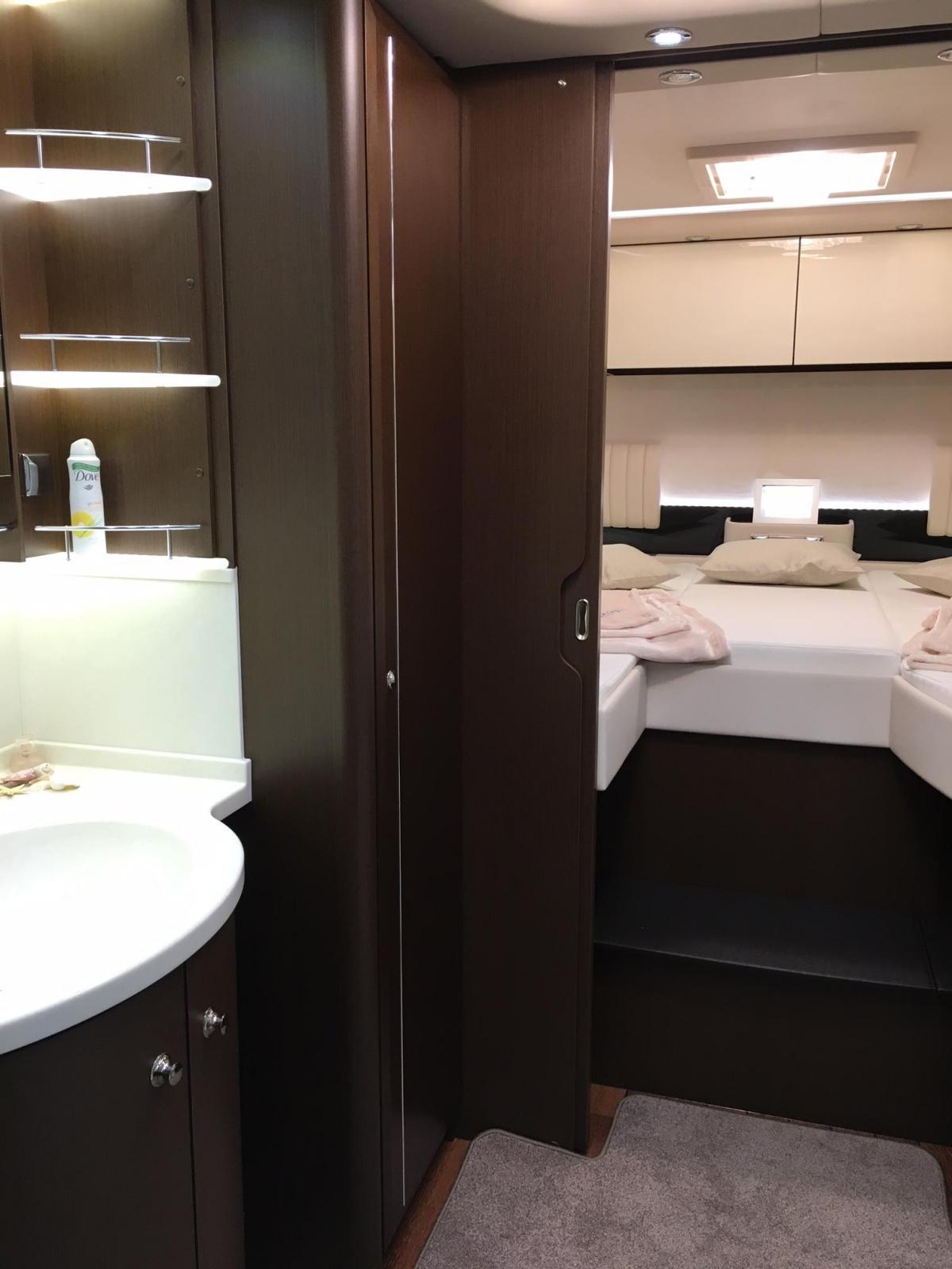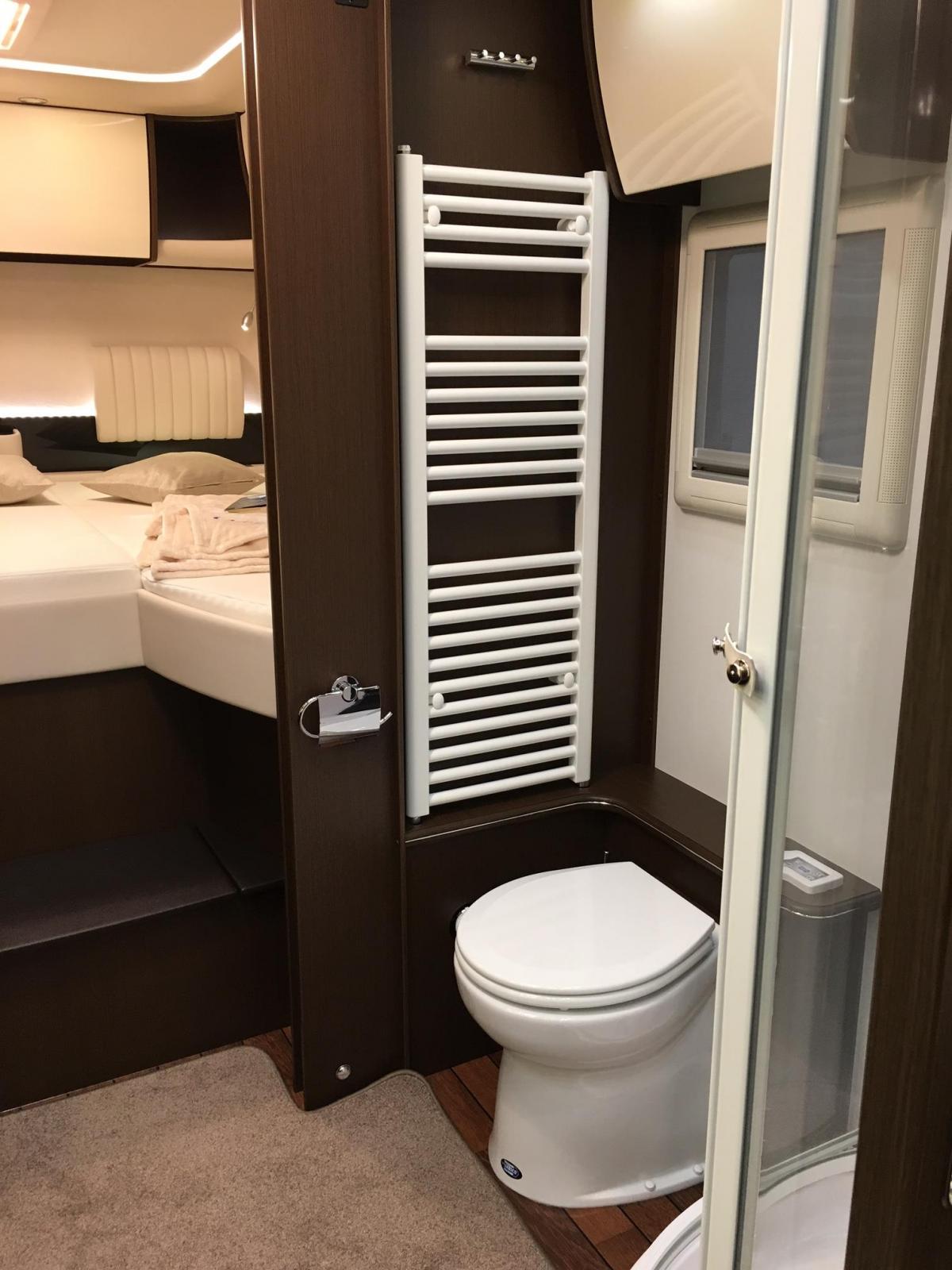 Handdukstork intill porslinstoaletten. Mjuka mattor i hela bilen ger den där extra lyxkänslan.