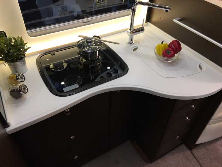 De ljusa ytorna ger en luftig känsla i sittgruppen som är mer än en U-soffa. Nästan en O-soffa rentav! En sektion av soffan in mot hytten kan tas bort för passage.