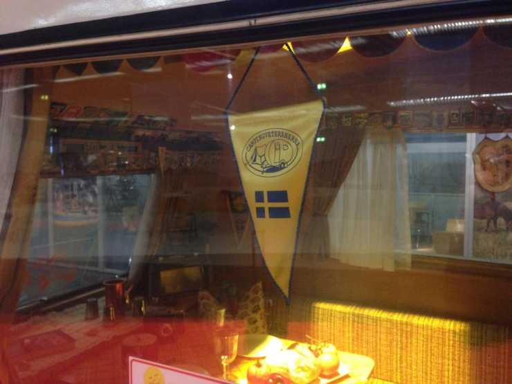Där det hängde en svensk vimpel med texten "Campingveteranerna" i fönstret.