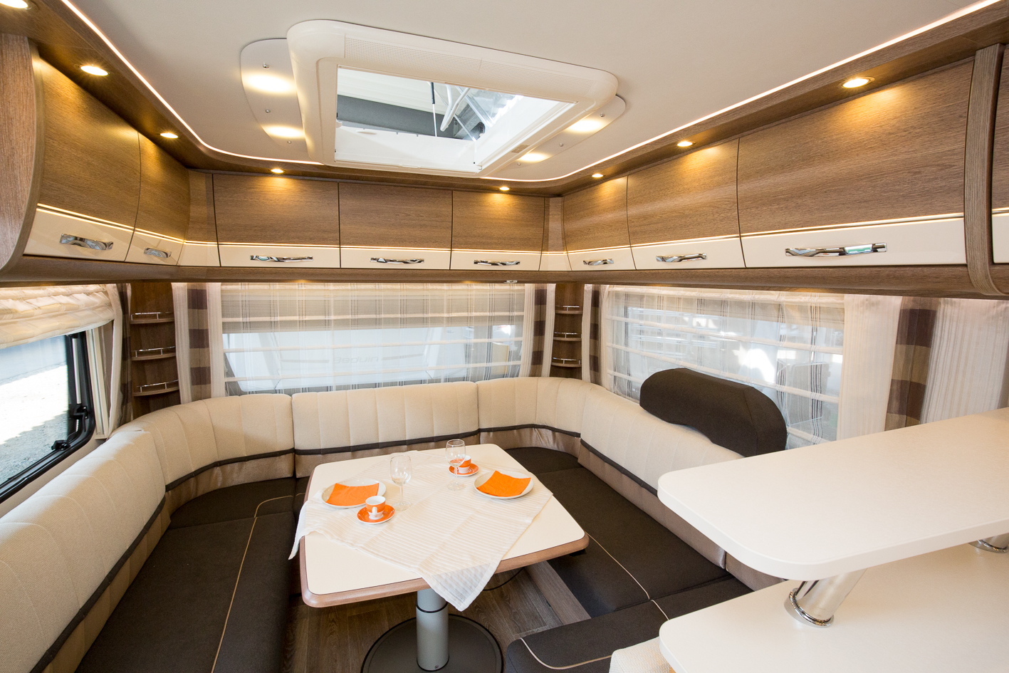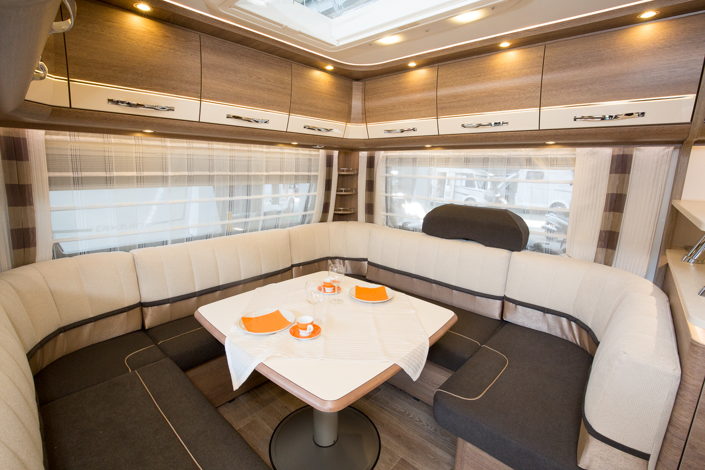 U-soffa brukar vi säga men här är det nästan en O-soffa eller kanske C-soffa. Nåväl, den rymmer minst hela familjen för saft och kaffe.