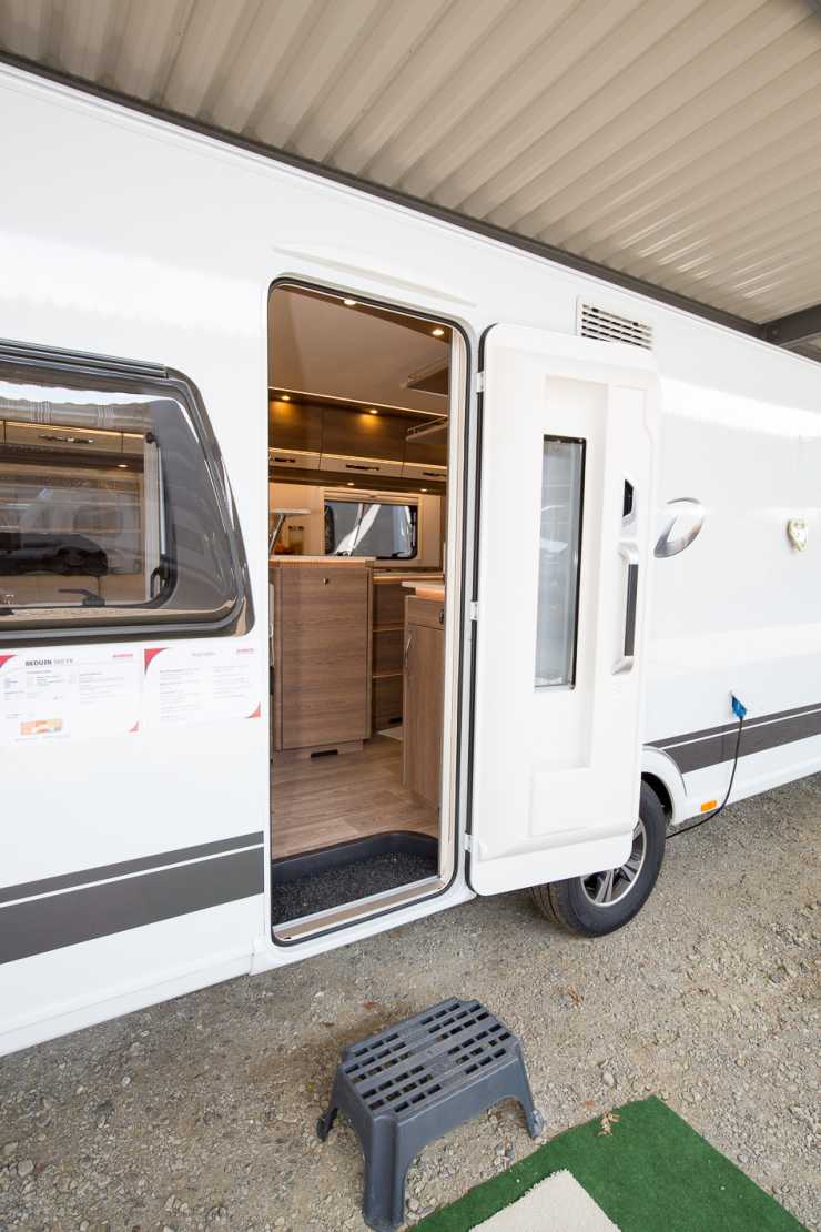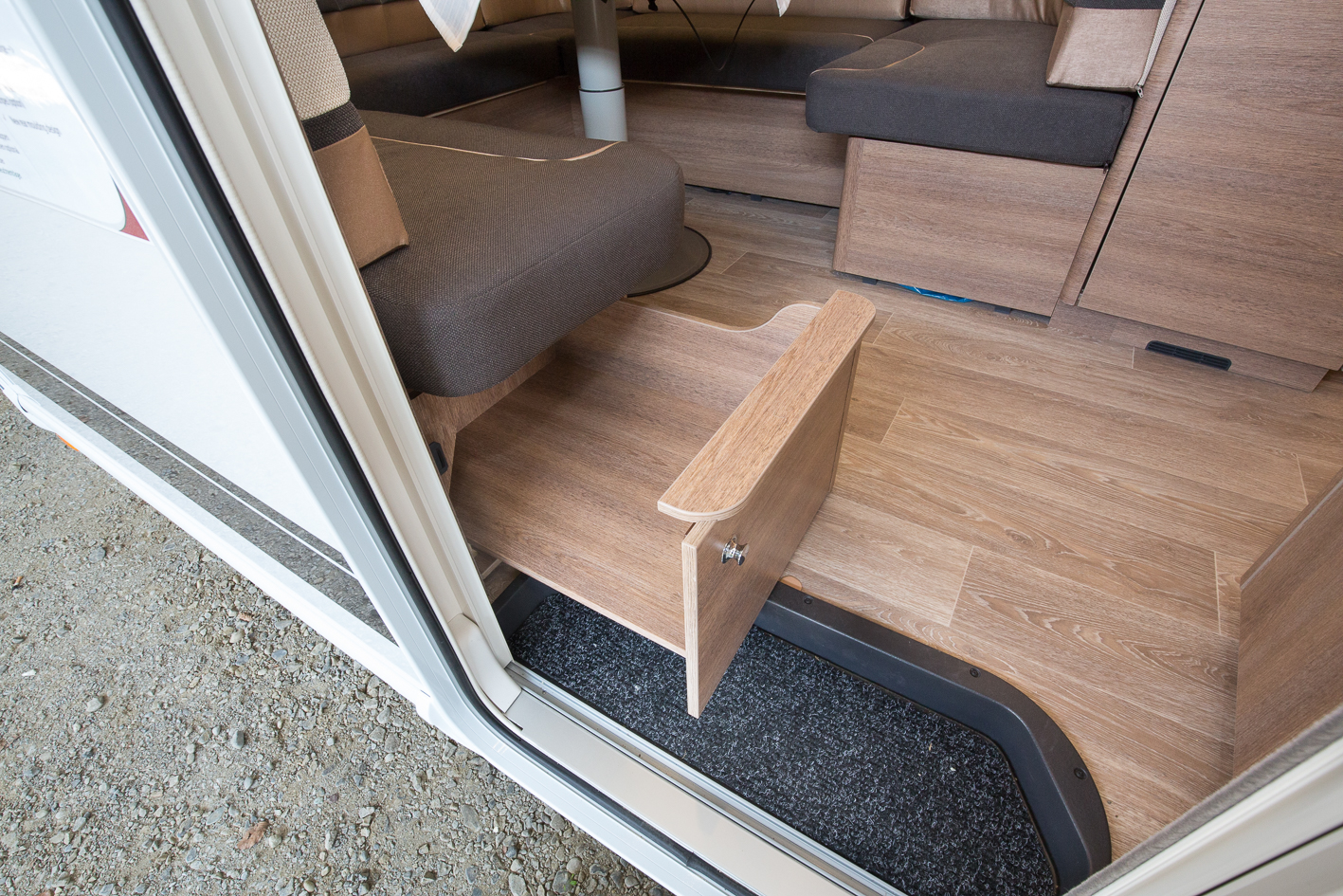 Golvet är aningen nedsänkt innanför den breda bodelsdörren som försetts med en fönsterglugg. Myggnät finns också att stänga för med.