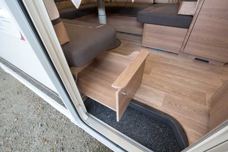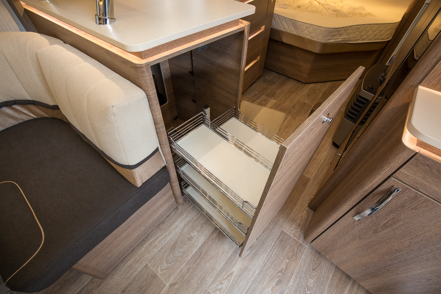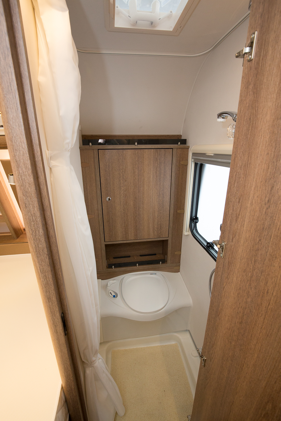 Avdelad garderob med plats för klädhängare och vikta småkläder intill. Under sitter värmepannan. I det här fallet luftburen Truma.