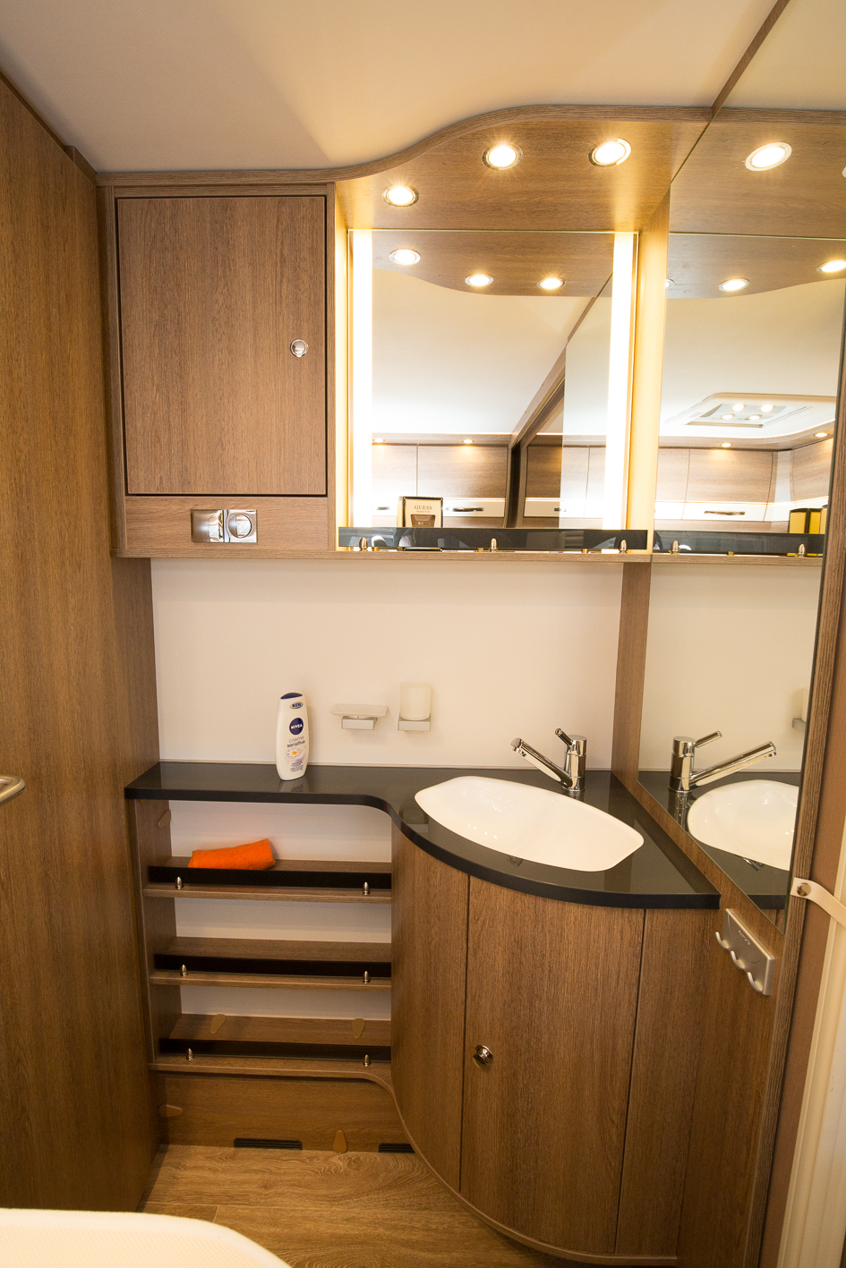 Praktiskt! Handfat och gott om hyllor. Bänken ser lättstädad ut och det finns tillräckligt med speglar och några krokar till småhanddukar.