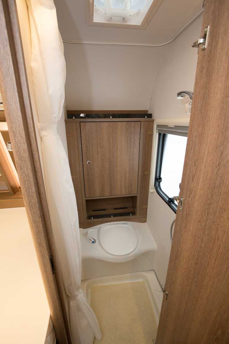 Sittande på toaletten får man finna sig i att ha fötterna i duschkaret men det är ett effektivt utnyttjande av utrymmet.