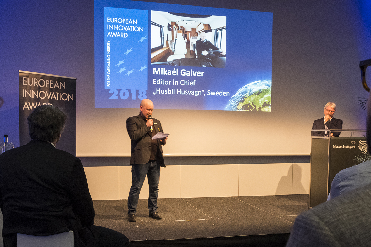Husbil & Husvagns chefredaktör Mikael Galvér håller ett tal inför en delvis hänförd publik.