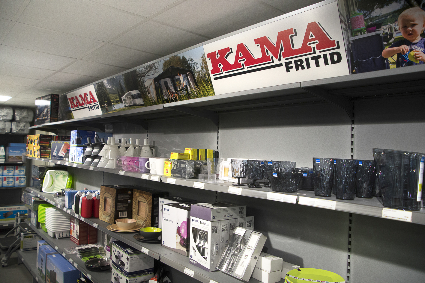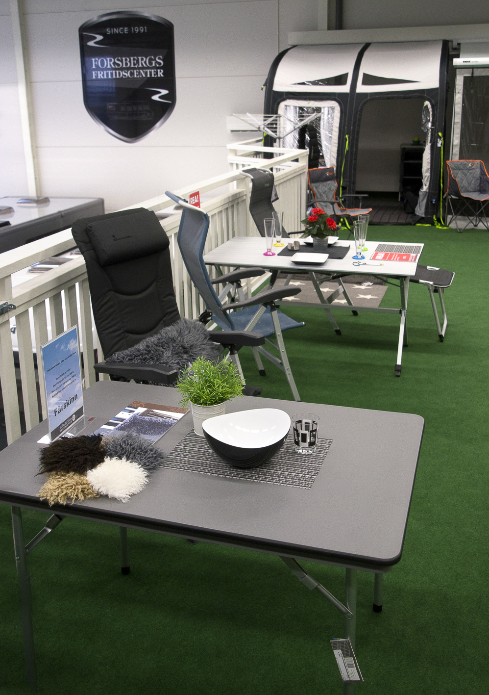 Tillbehörsbutik med visning av tält, markiser och campingmöbler
