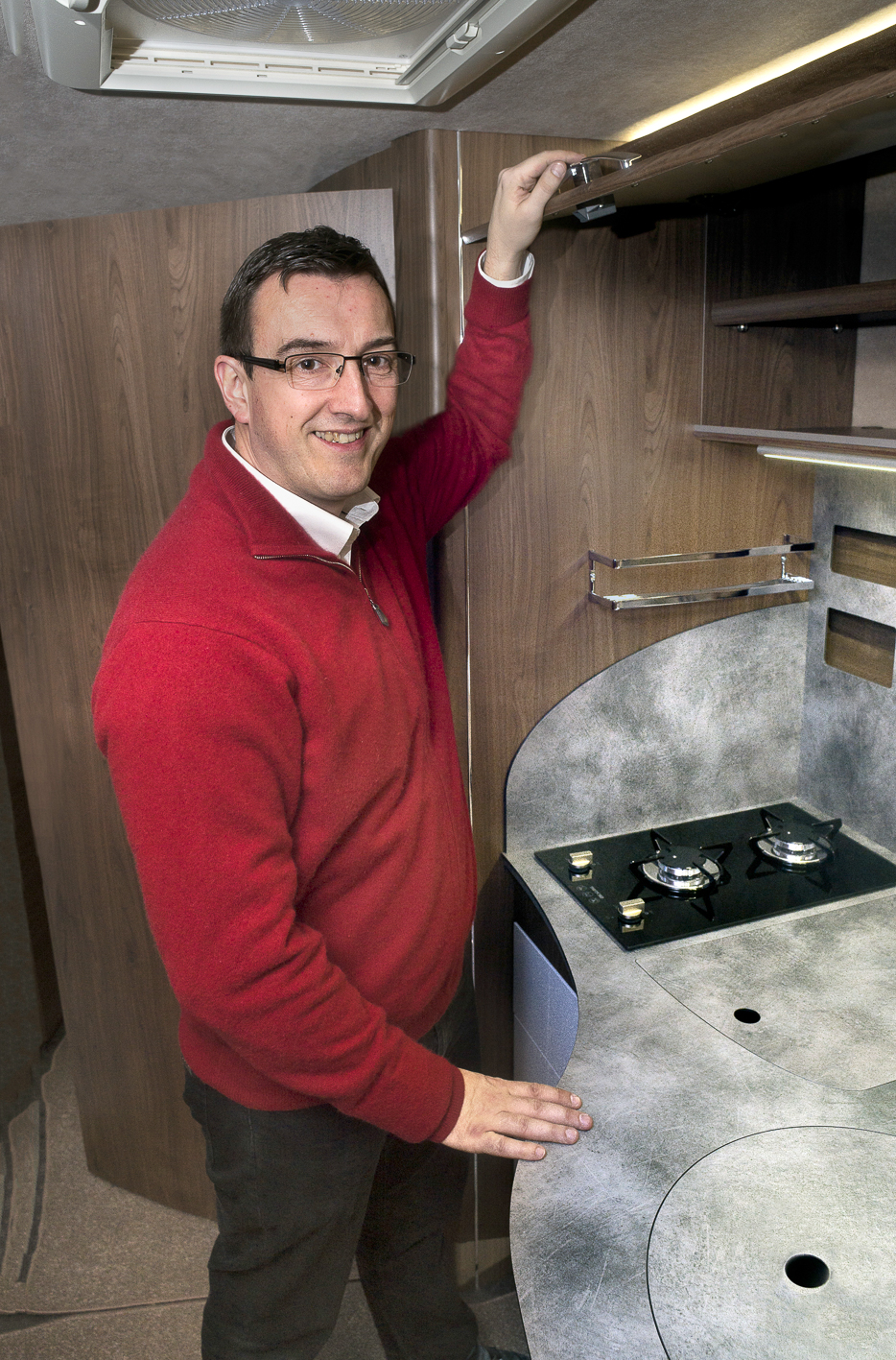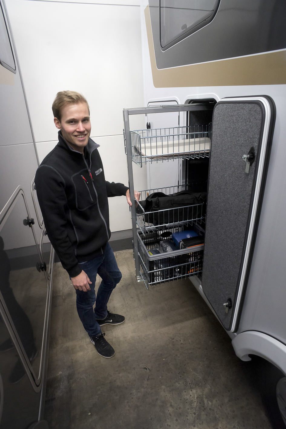 Försäljare Simon Westerling visar genomtänkt lastutrymme i en Frankia