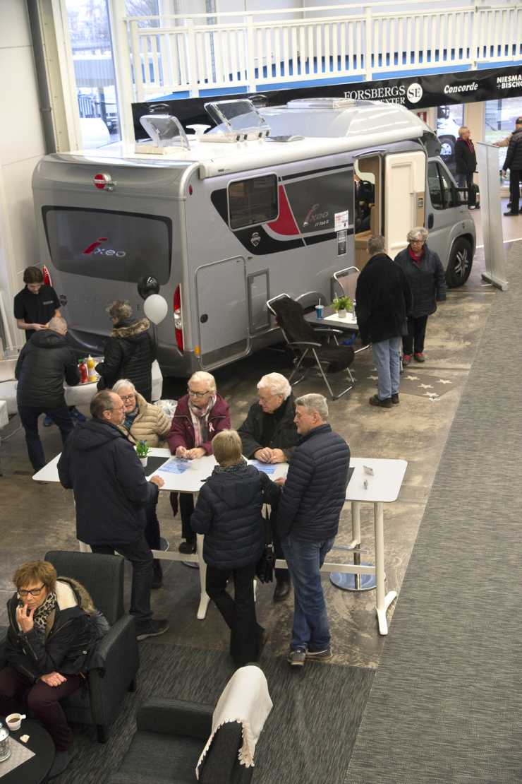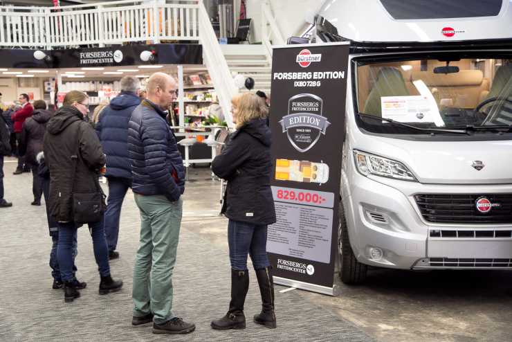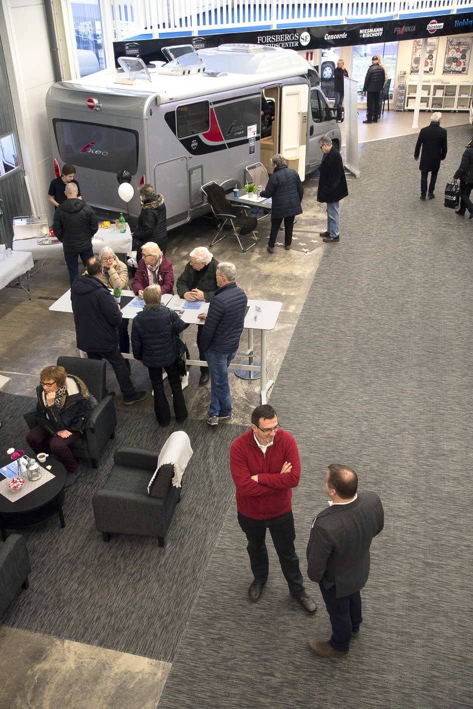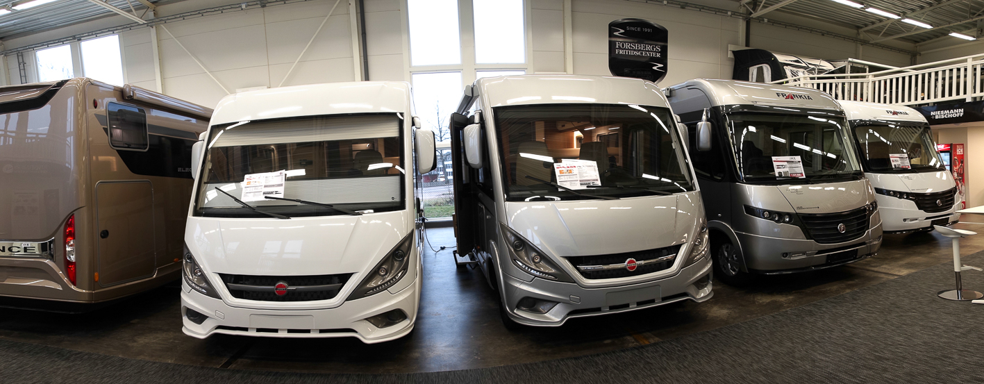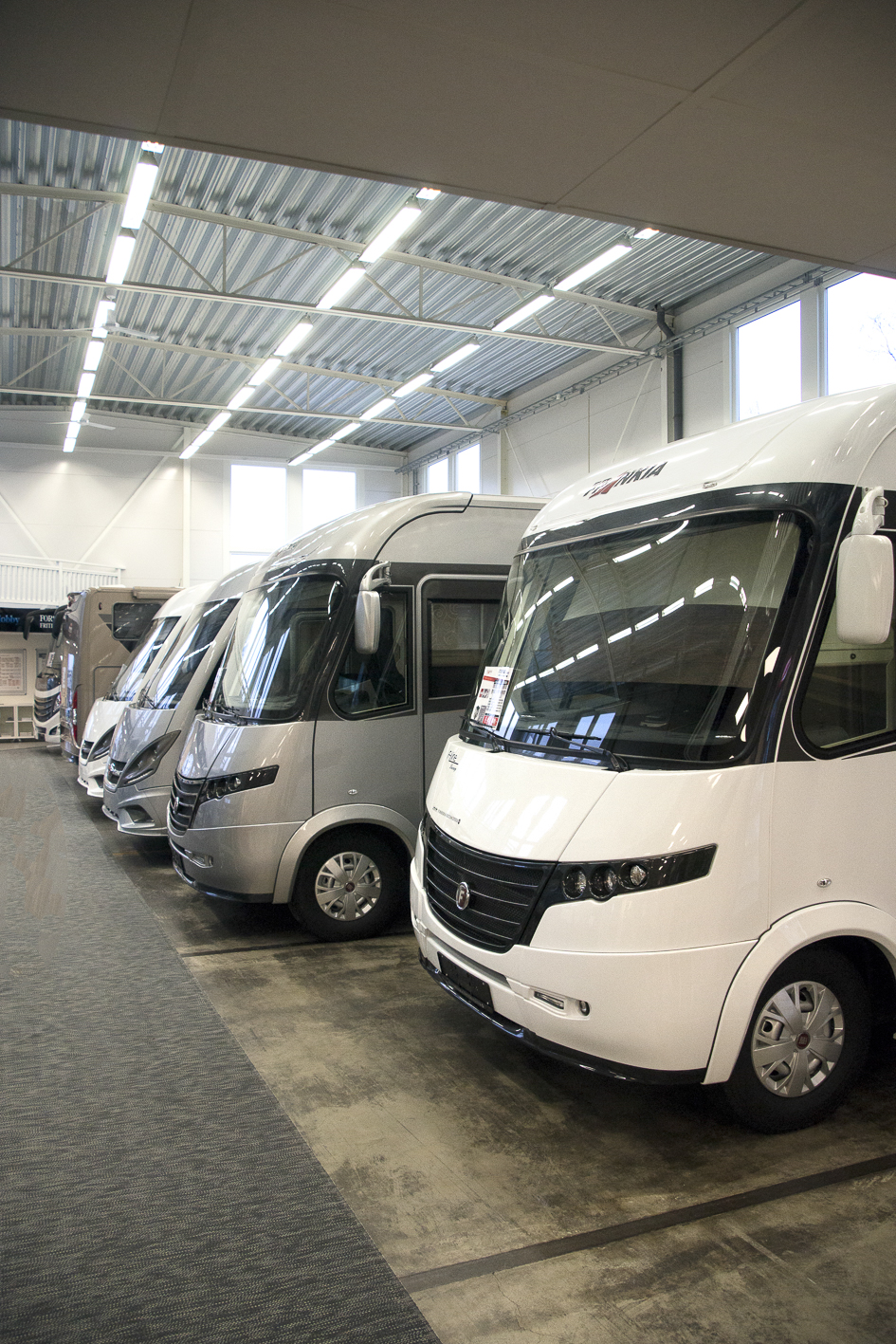 I rymliga och ljusa lokaler på 1000 kvadratmeter visas husbilar från bland annat Hobby, Bürstner och Frankia