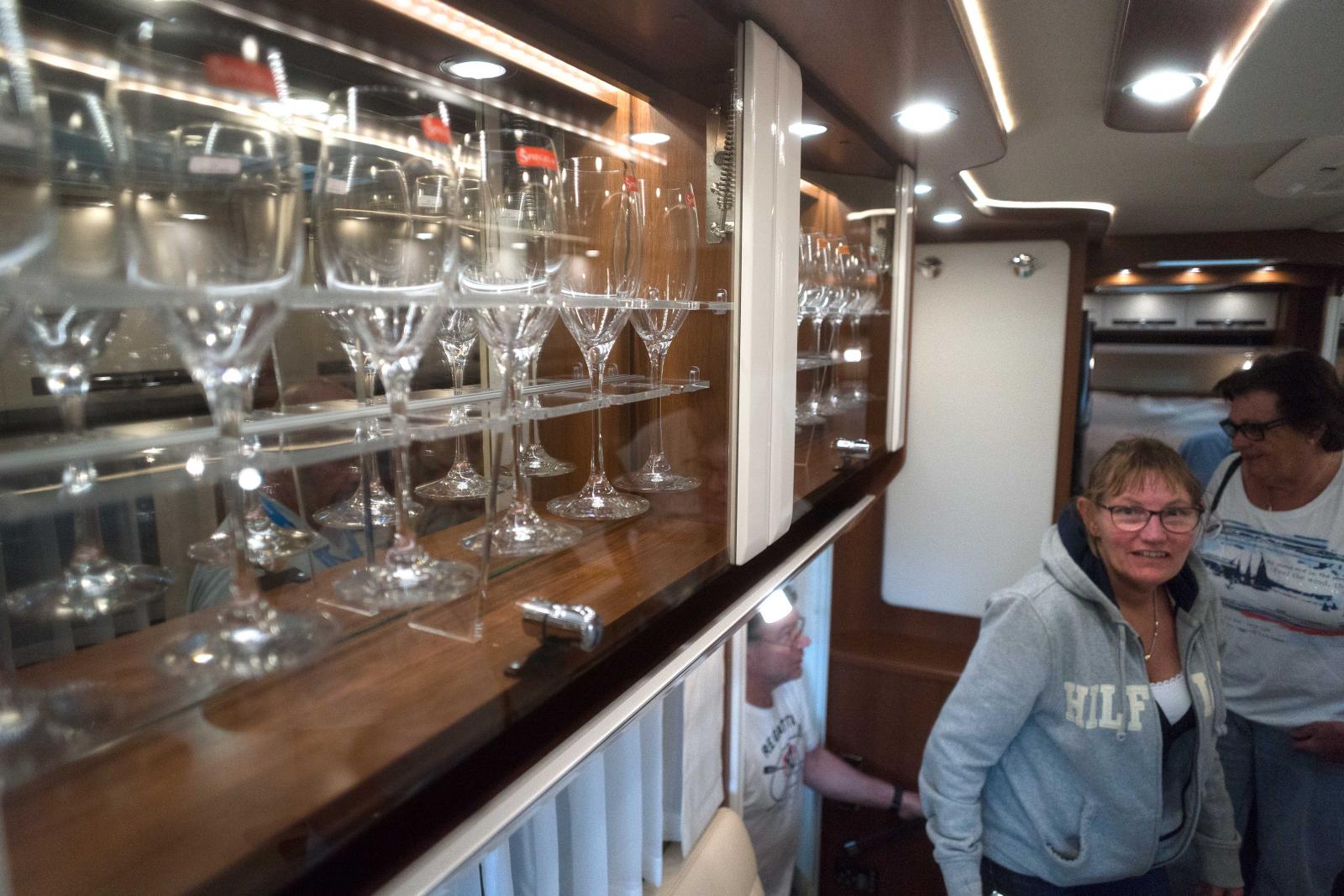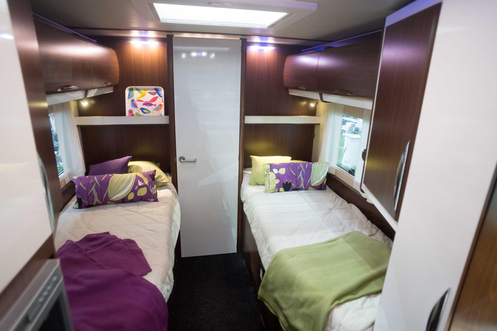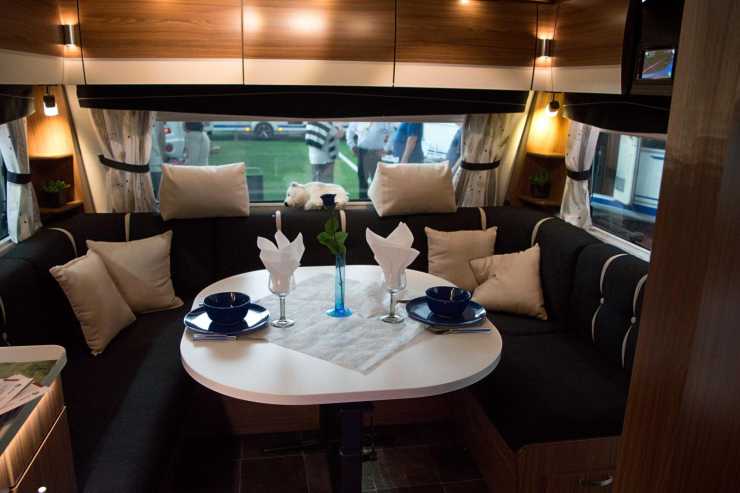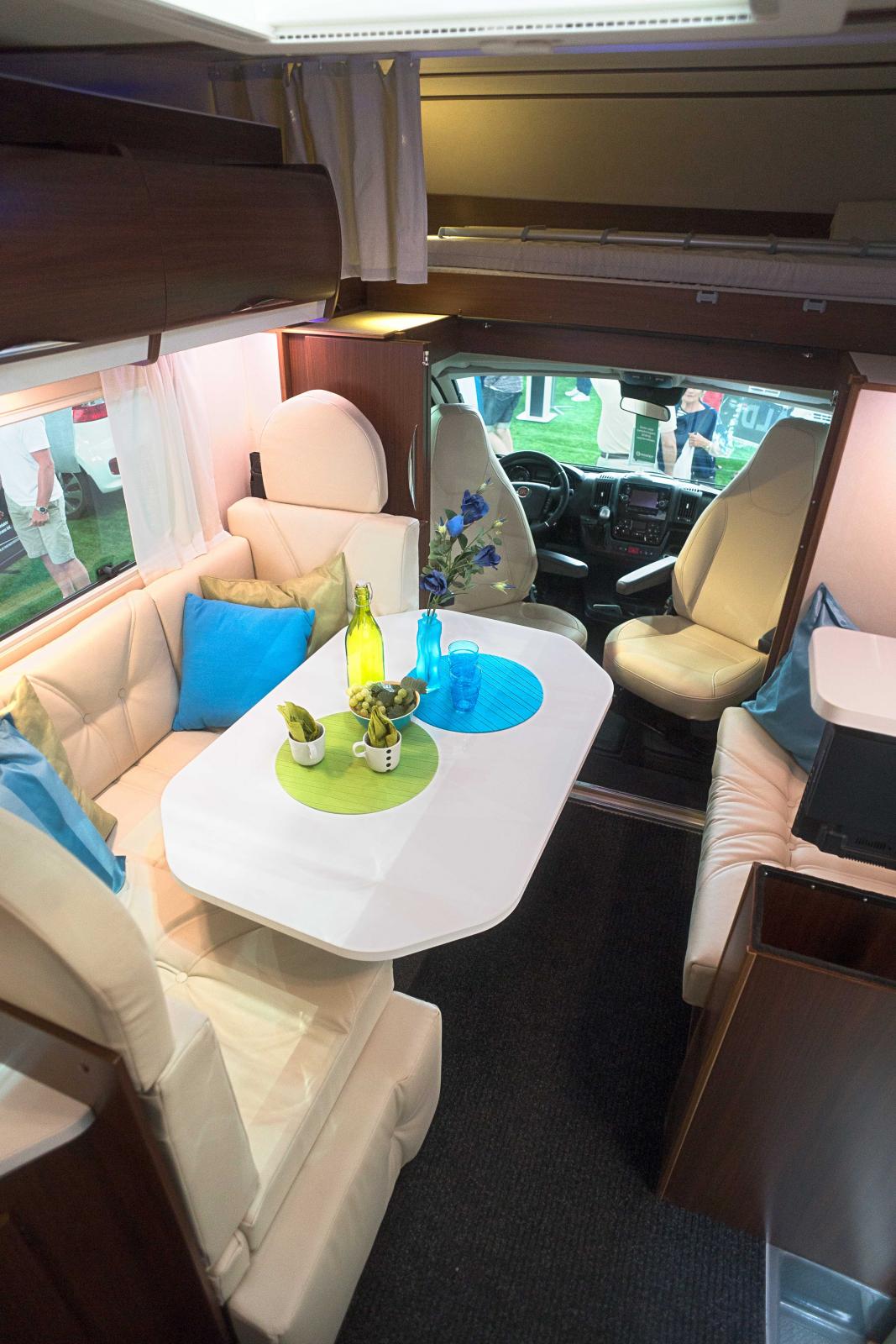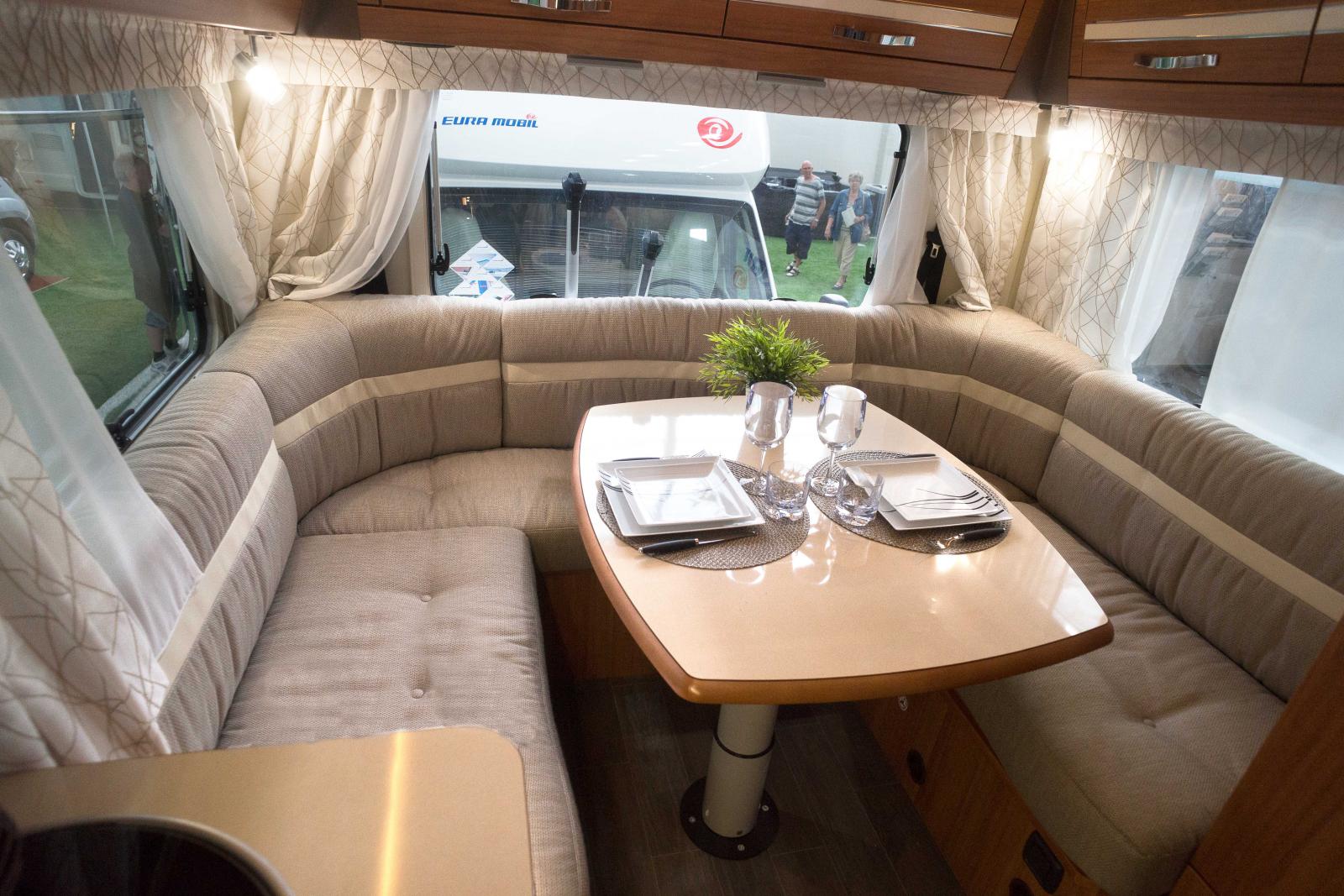 Som i husvagn. Annorlunda lösning med sittgrupp bak i Eura Mobil TA 570 HS.