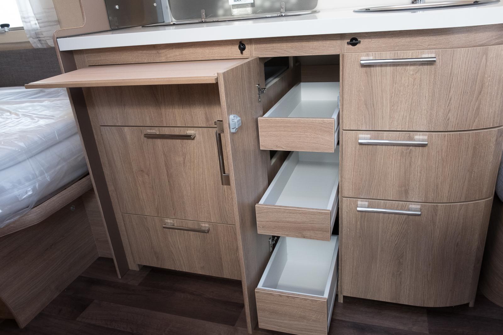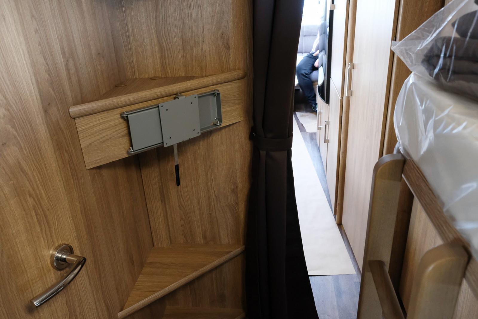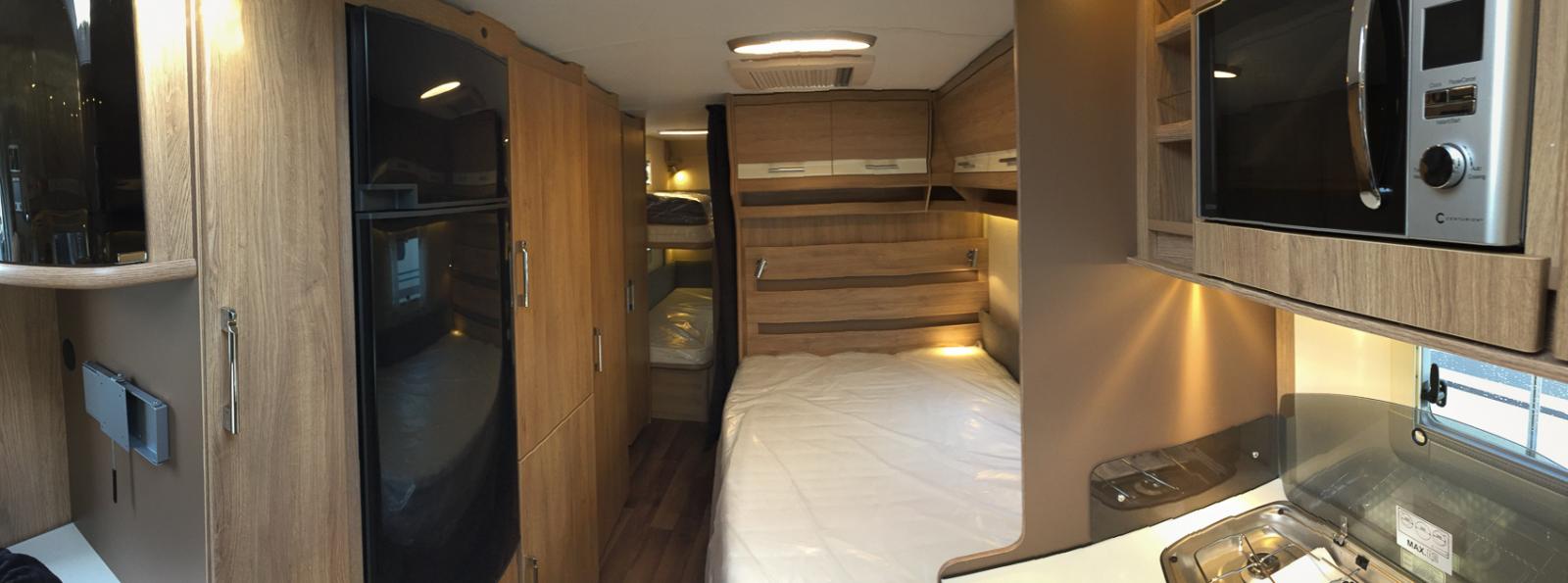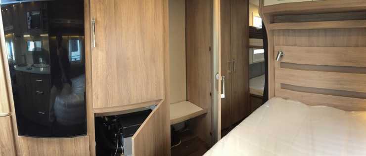 Mitt i vagnen finns säng för de vuxna och många garderober.