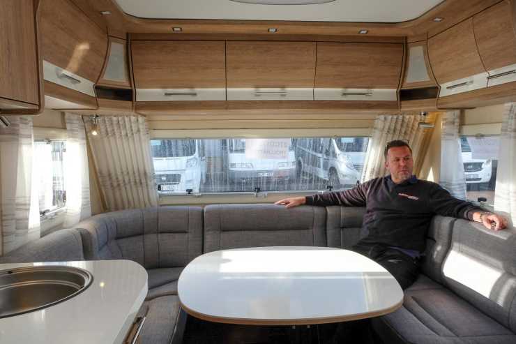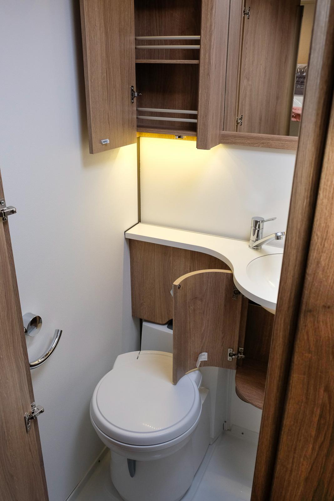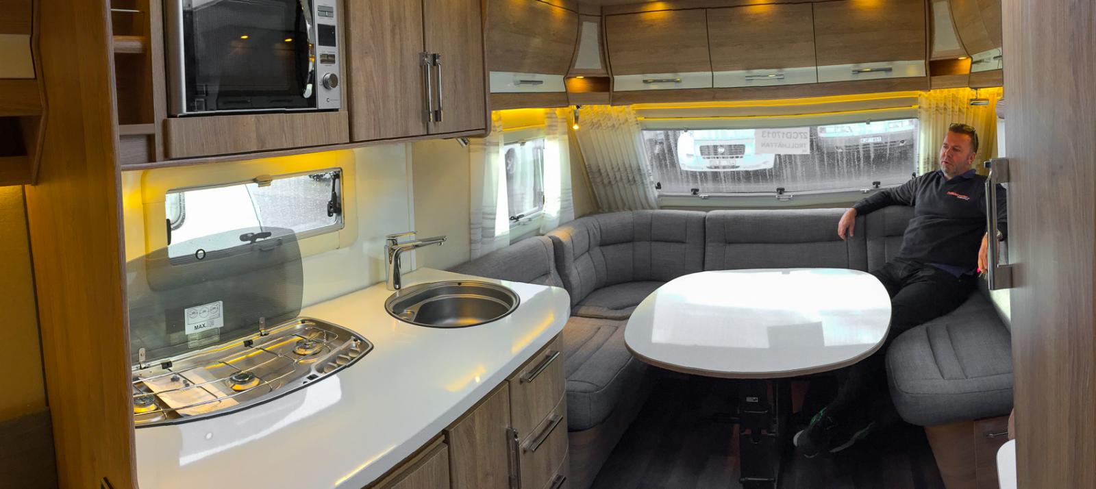 Mitt i vagnen finns säng för de vuxna och många garderober.