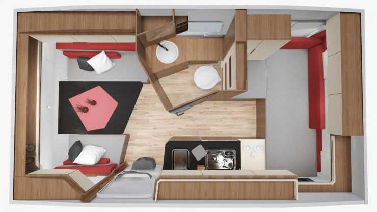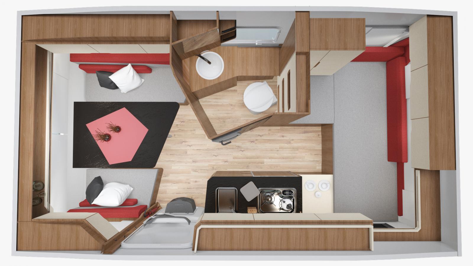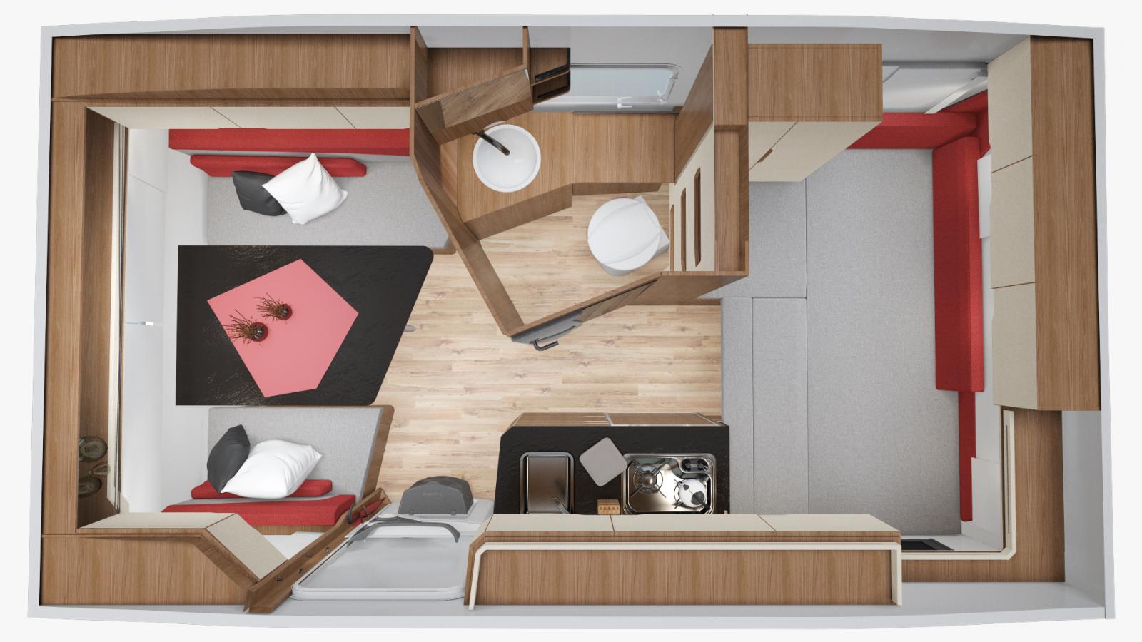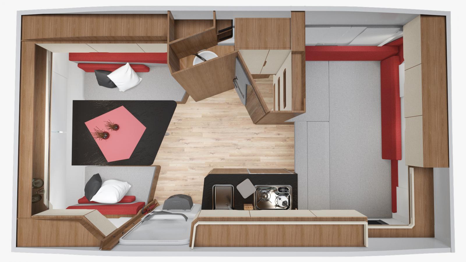 Tack vare en väggskena kan garderoben/toaskåpet flyttas genom väggen från toautrymmet till sovutrymmet.