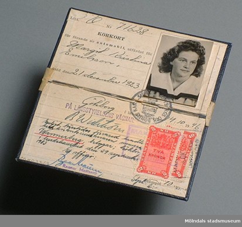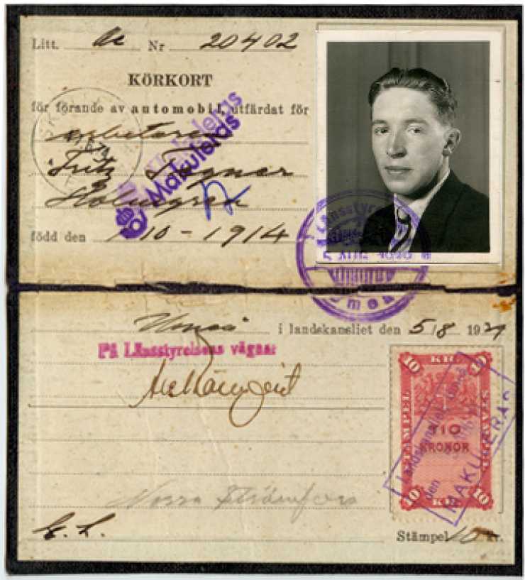 På det här körkortet från 1923 har fotografiet dessutom försetts med två stämplar för att försvåra byte av det.