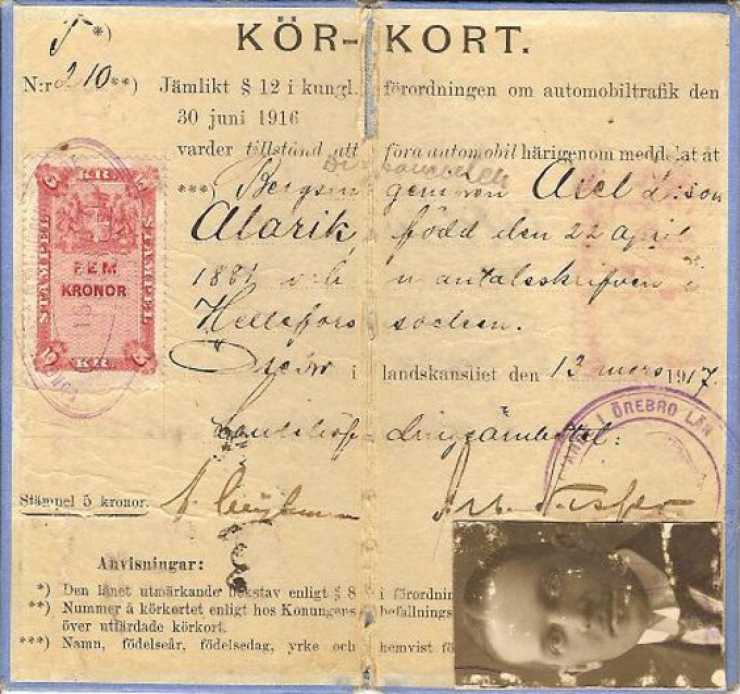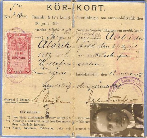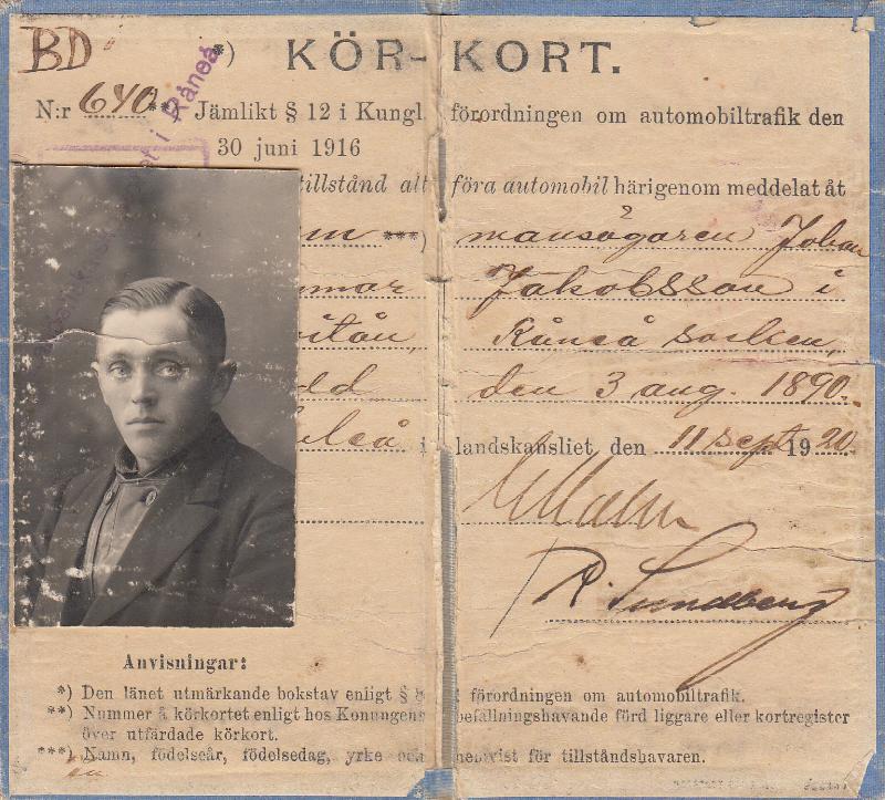 1916 kom nationella regler för körkort som fick detta utseende och utfärdades länsvis. Eftersom kravet på fotografi kom först 1924 klistrades detta i det här fallet ovanpå texten i nederkanten.