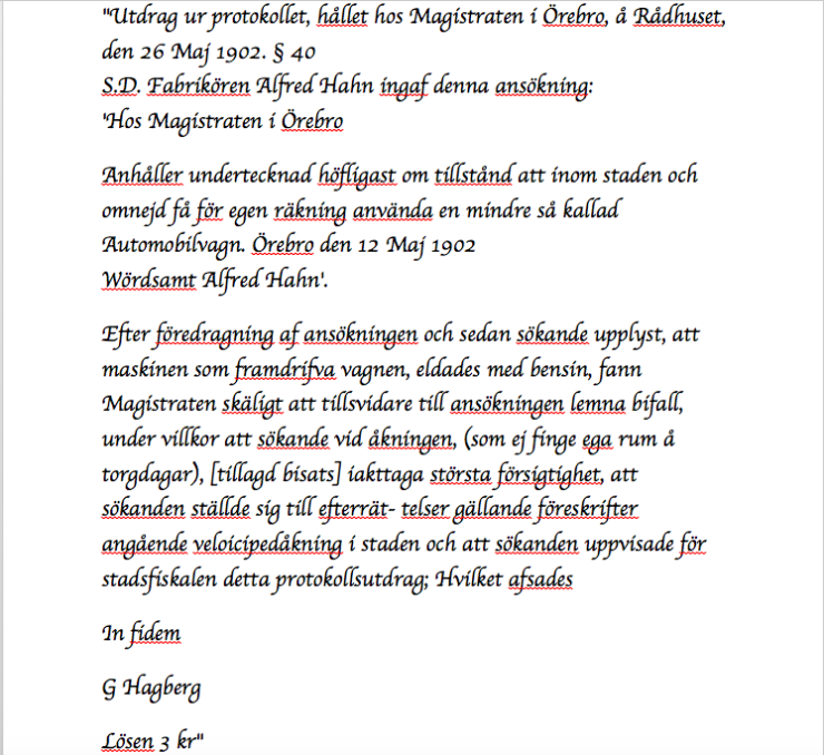 Detta utdrag ur ett beslutsunderlag betraktas som det första körkortet i Sverige.