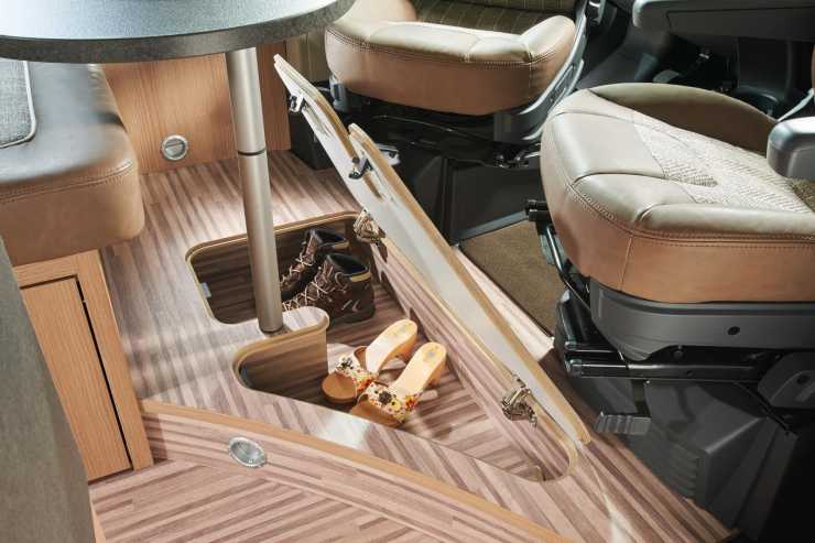 Förvaringen och luckan i dubbelgolvet under sittgruppen har utökats och rundar bordsbenet.