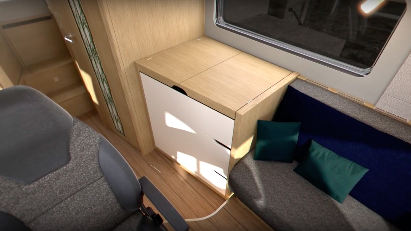 Till vänster syns sideboardet/köket i hopfällt läge och bordet till höger.