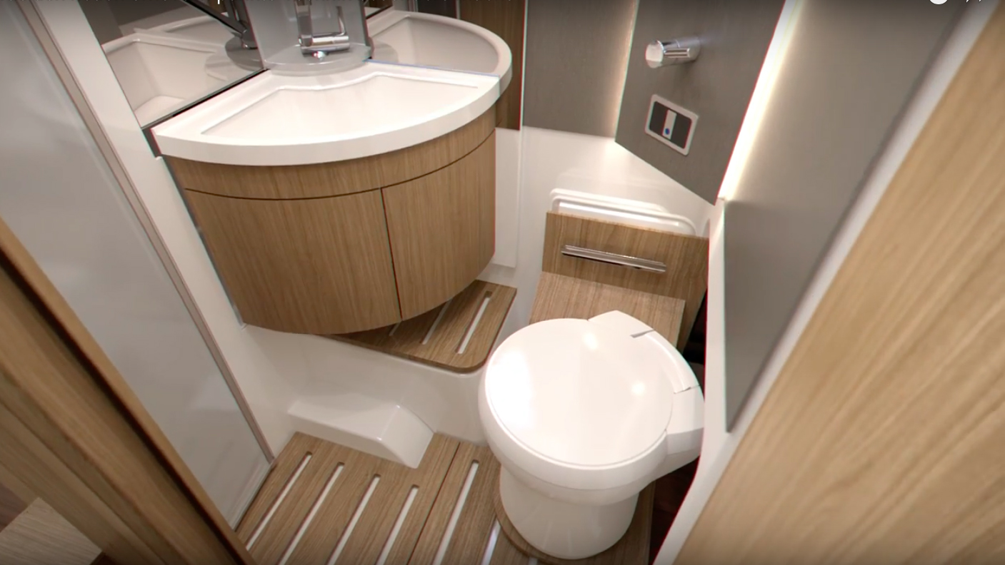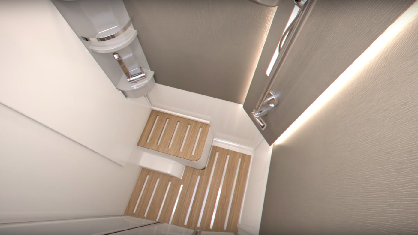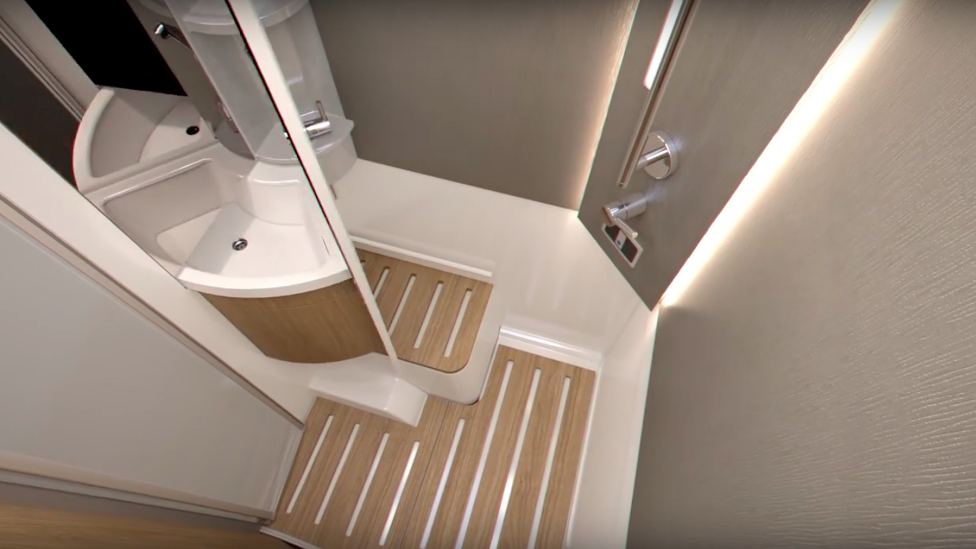 Hygienutrymmet präglas av samma idé. Så här ser det ut med toalettstolen utfälld