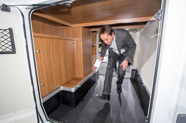 Under sängarna finns ett stort förvaringsutrymme. En Tysk journalist kontrollerar gåbarheten.