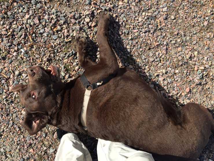 Hunden Jack är på besök. Han gillar att ligga vid fötterna och prata.