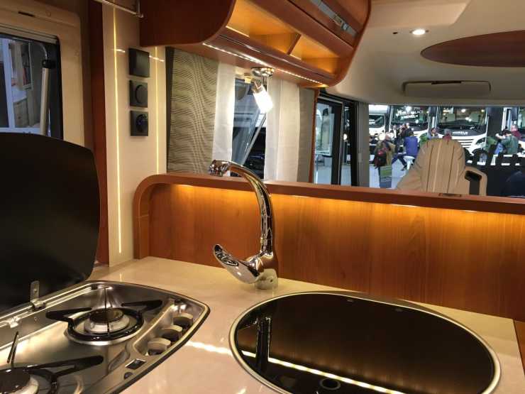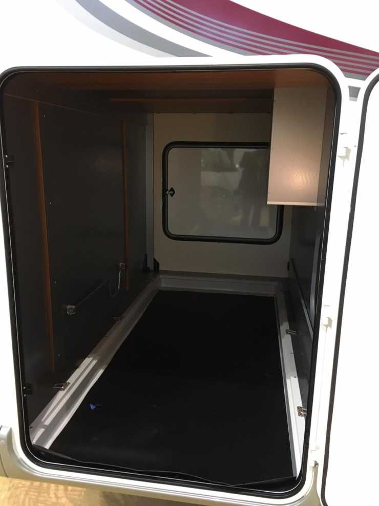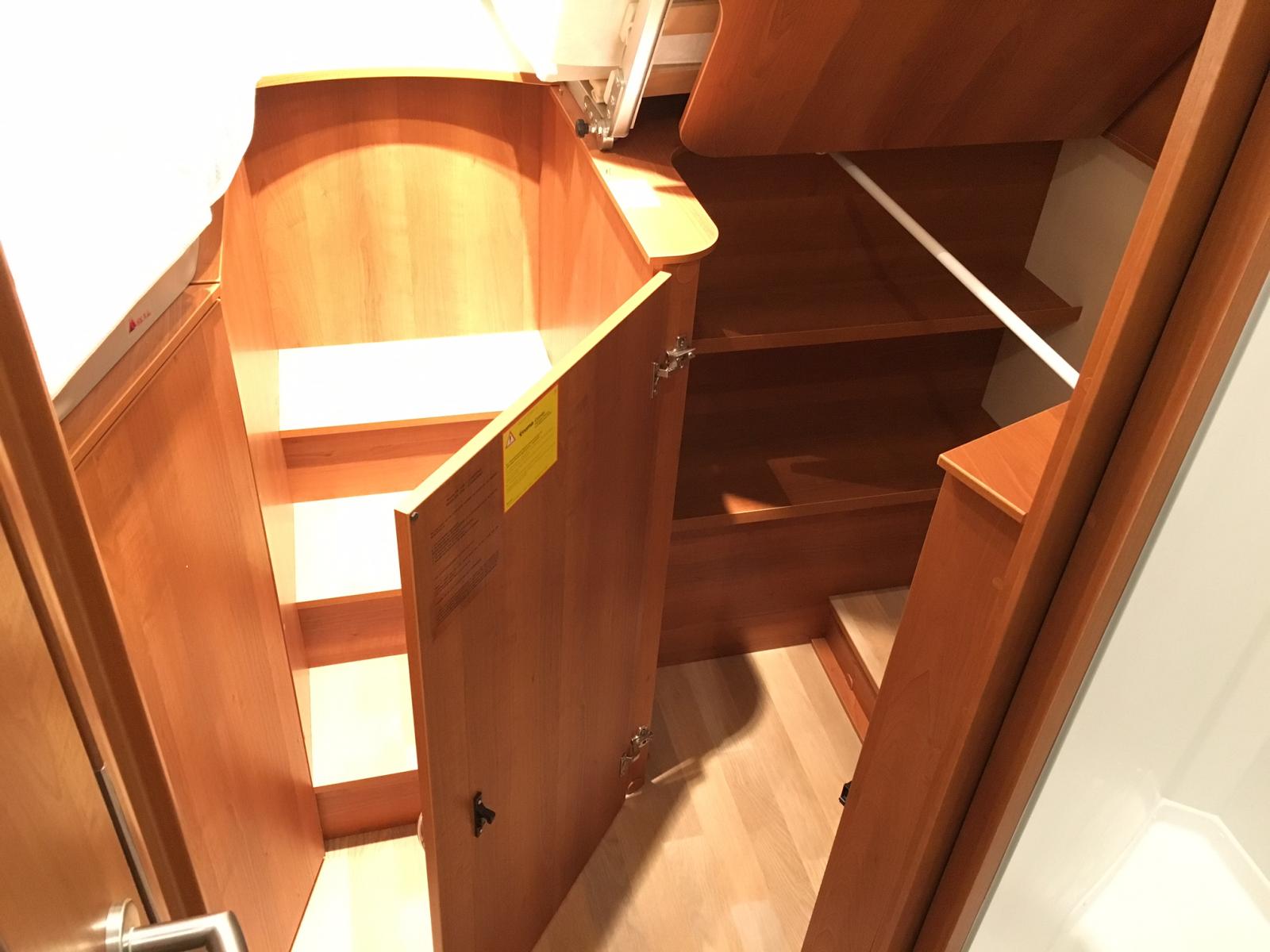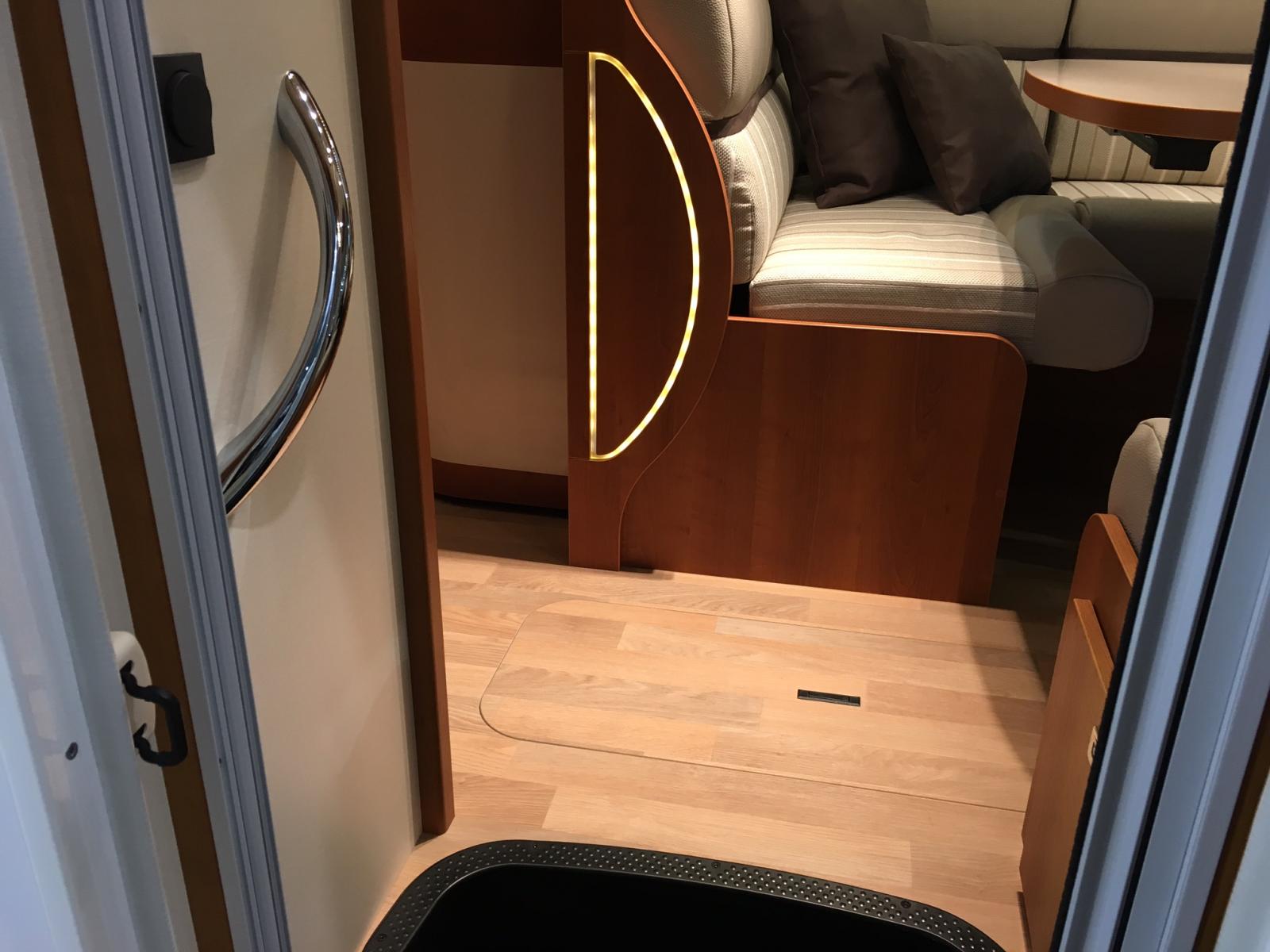 Toalettutrymmet/duschen kan stängas av med dörrar både mot sovrum och kök. Servicelucka syns i golvet i mittgången.