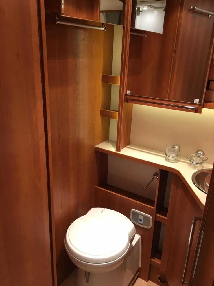 Gott om förvaring i hyllor och skåp. Vridbar toalettsits.