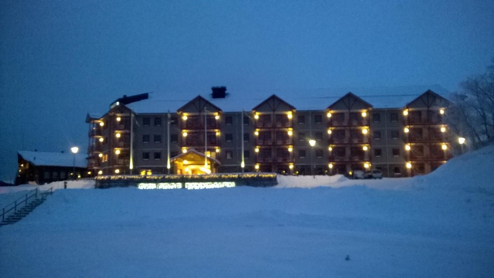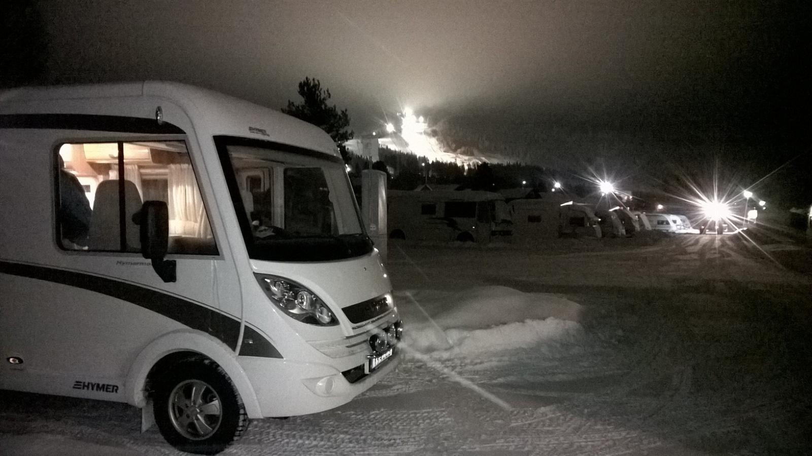 Kläppen camping by night med Kläppen ski resort i bakgrunden. Kläppen Ski resort är en pärla för barnfamiljer, 5 av 5 husbilar! Plus för bra pistade backar, bra carvingbackar, toppstugan levererade utmärkt gott fika, bra camping och bra för barnfamiljer.