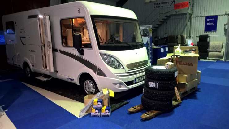 Husbilen har preci rullats för montering av vinterhjul och extraljus. Sedan ska alla roliga saker som KAMA Fritid ställt upp med plockas in.