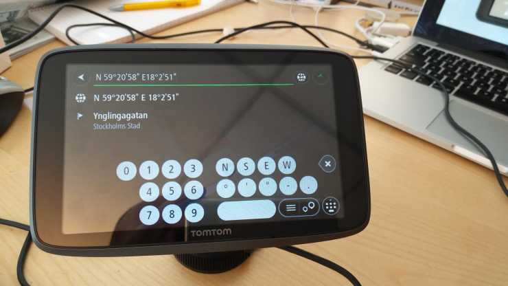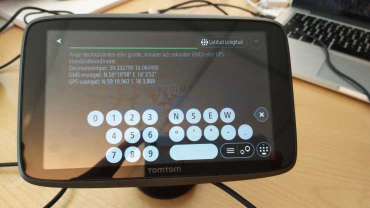 När det blir dags att skriva in siffrorna kan du på denna TomTom-modell se ett exempel. Enligt vårt sätt att skriva är det "GMS-exempel" som gäller. Här ser du samtidigt vilka koordinater du befinner dig på för tillfället.