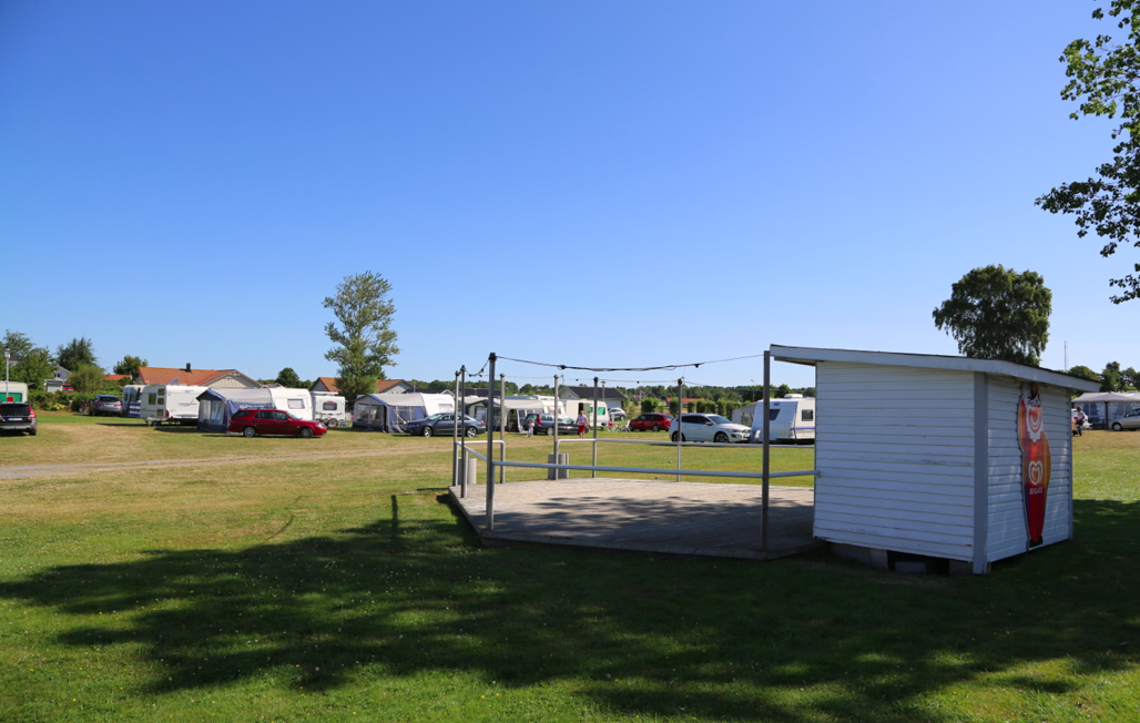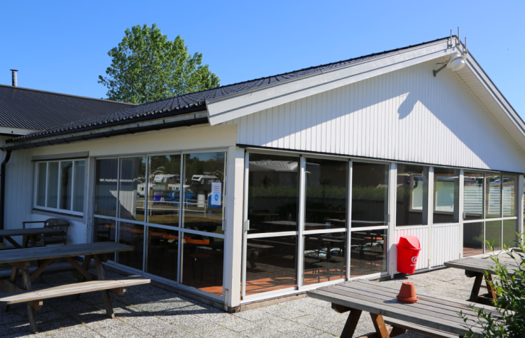 Butiken på campingen är välsorterad med det mesta som kan behövas till vistelsen. Här finns även en servering med pizza eller kaffe med tilltugg.