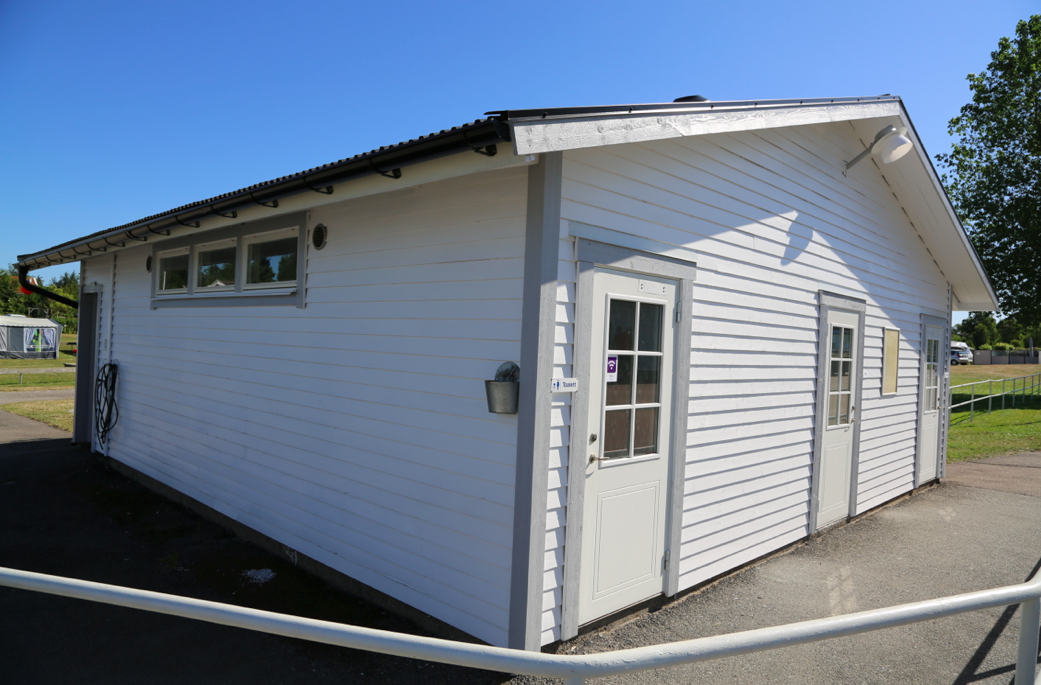 Det nya servicehuset med toaletter och duschar i en herr och en damavdelning ligger mitt på campingen.