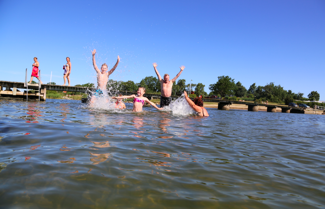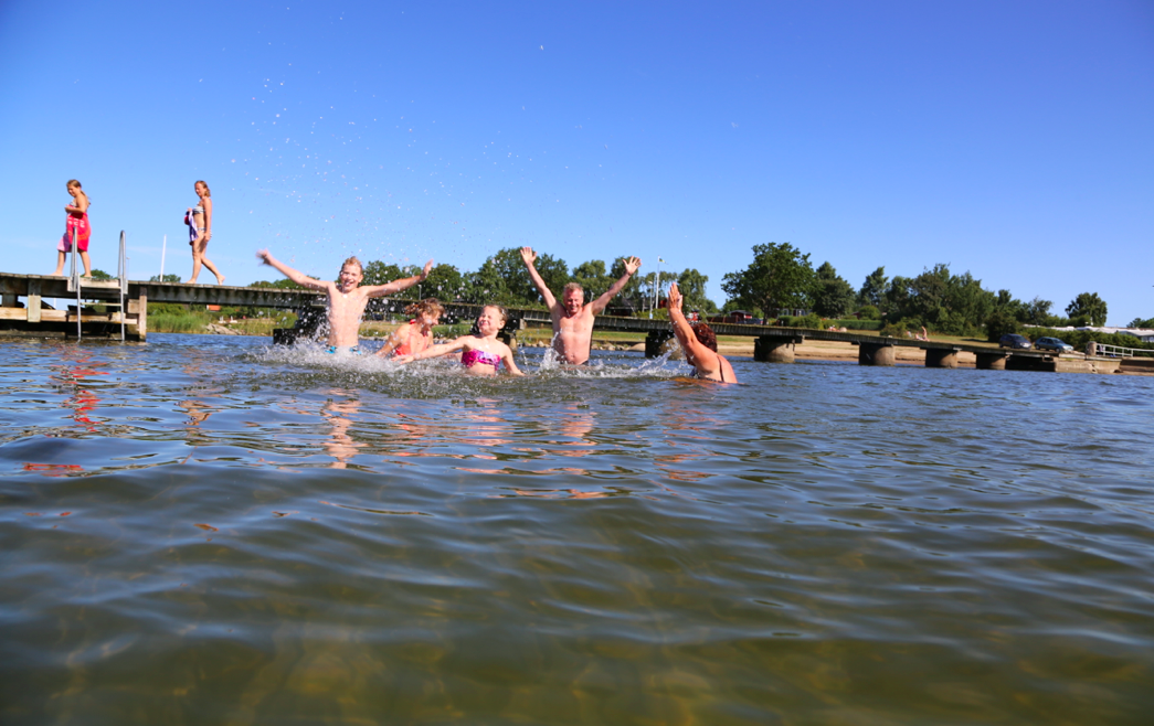 Fr.v. Ingalill, Lasse, Linnea, Lilian och Edvin är bland de första att doppa sig denna fredag förmiddag. Lilian har en Adria 753 och har bott på Trummenäs i 30 år medan de andra campar i sin Solifer Artic för första gången.