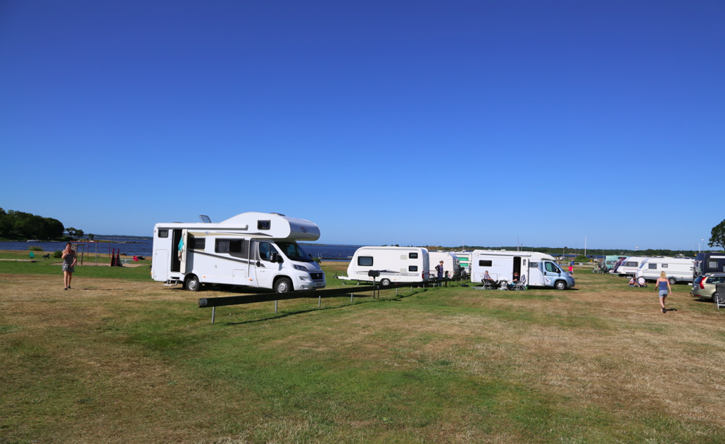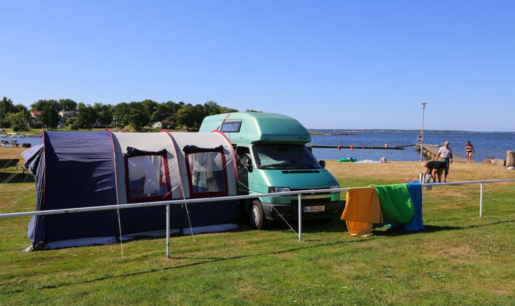 Liten Westfalia med stort förtält! Trevligt att morgondoppet bara ligger några kliv bort på Trummenäs Camping.