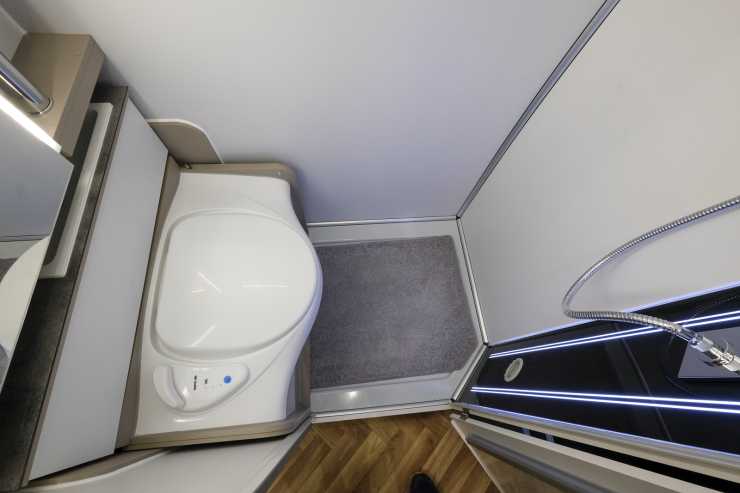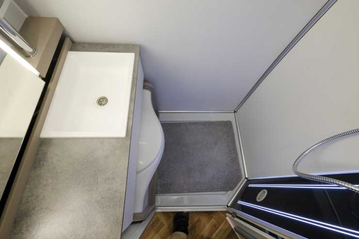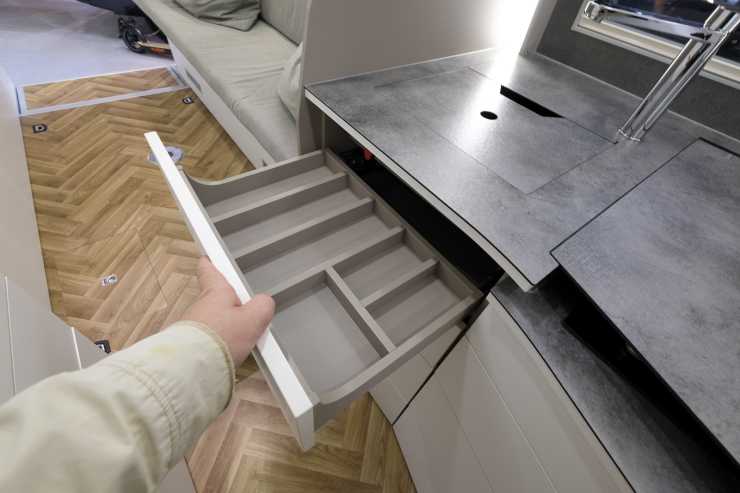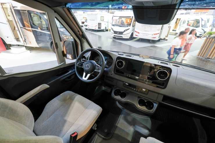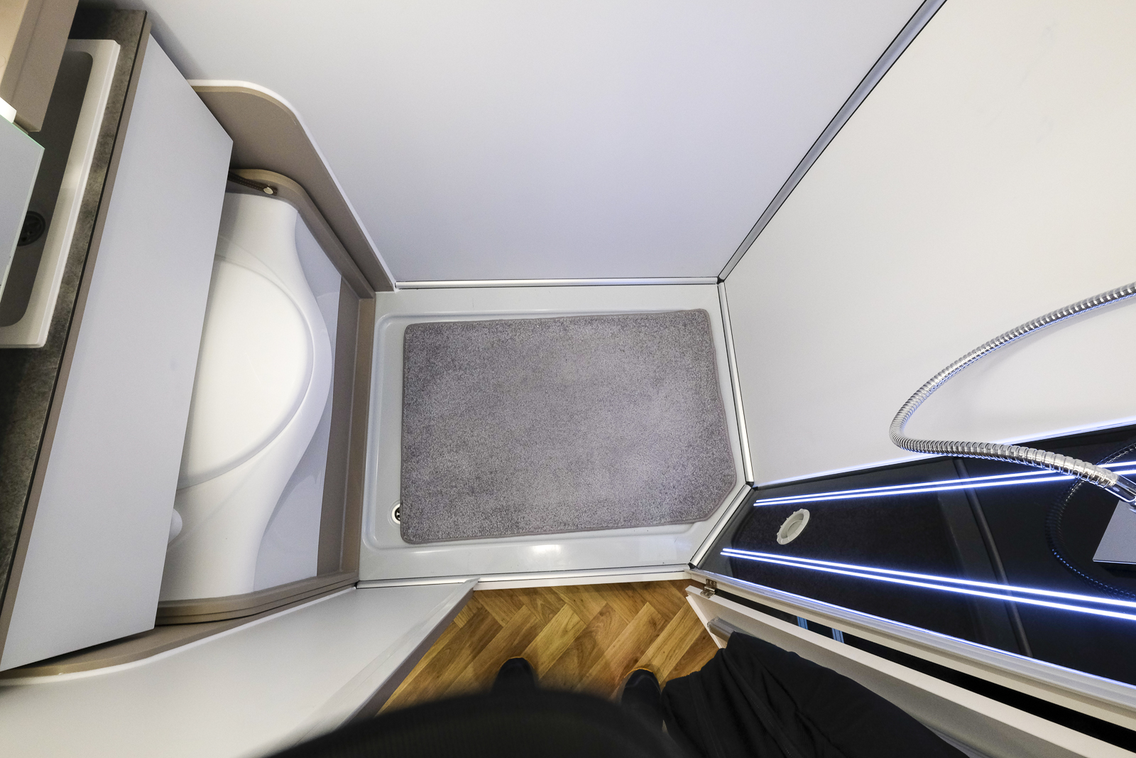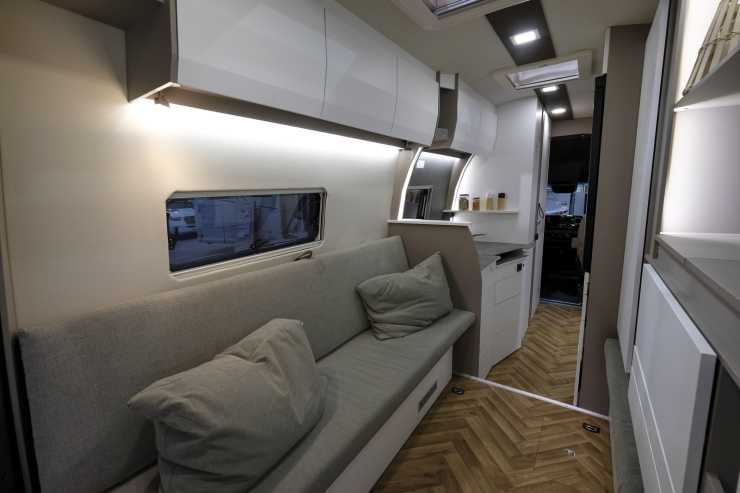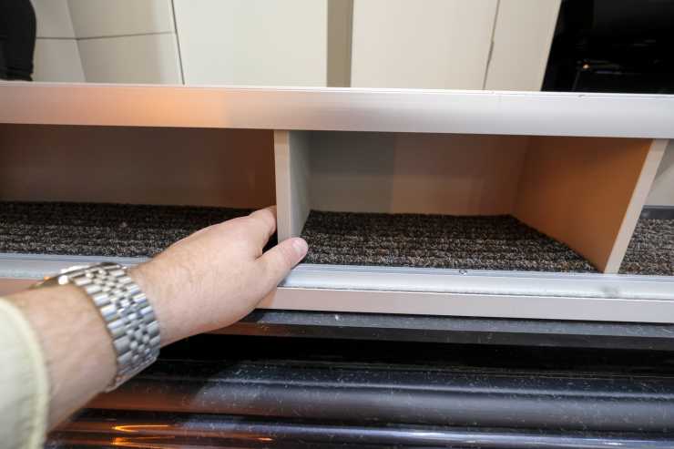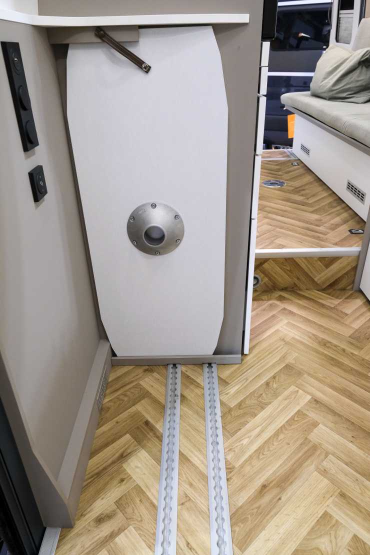 Vid sidodörren är det tydligt att det finns ett tekniskt dubbelgolv.
