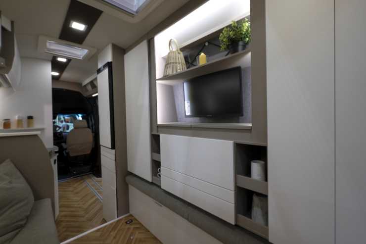 En stor tv till höger. Det går att trolla fram allt möjligt ur modulerna men vi kom inte åt att fota alla varianter!