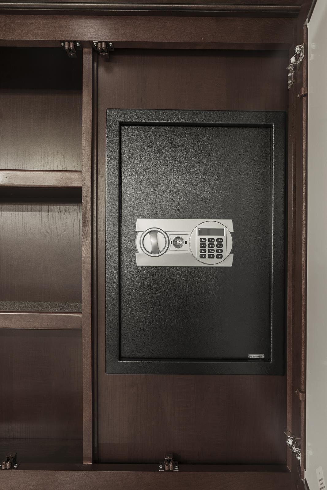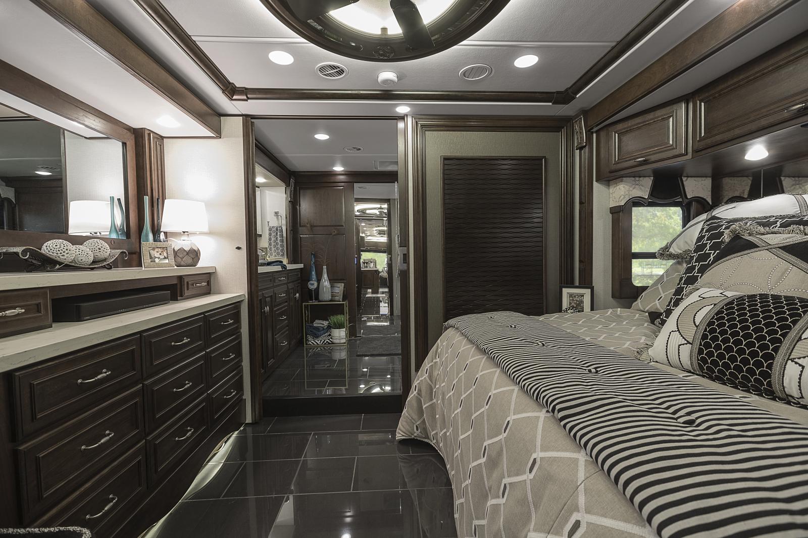 Master bedroom är extra rymligt när slideouten är helt utskjuten. TV går att hissa fram ur möbeln till vänster.