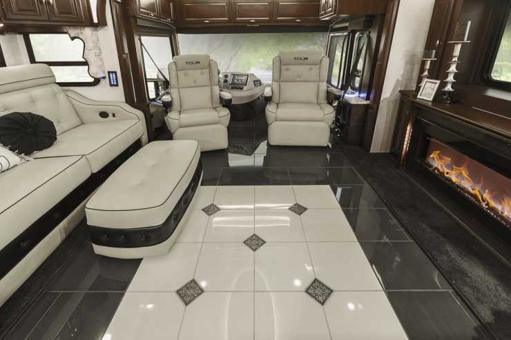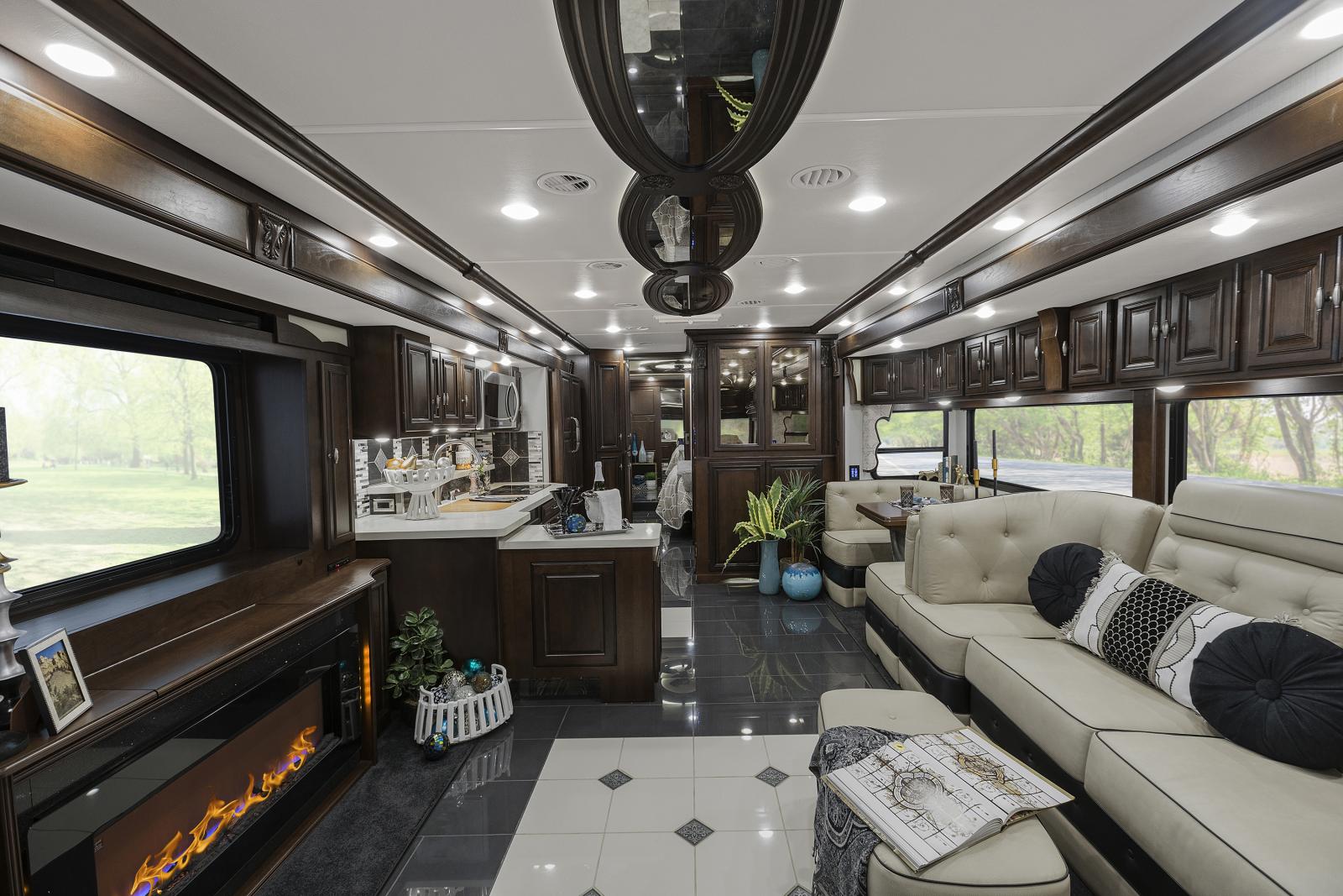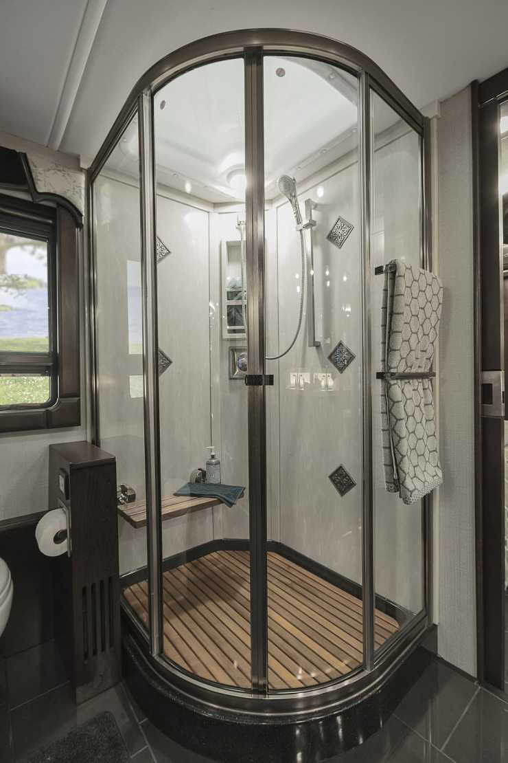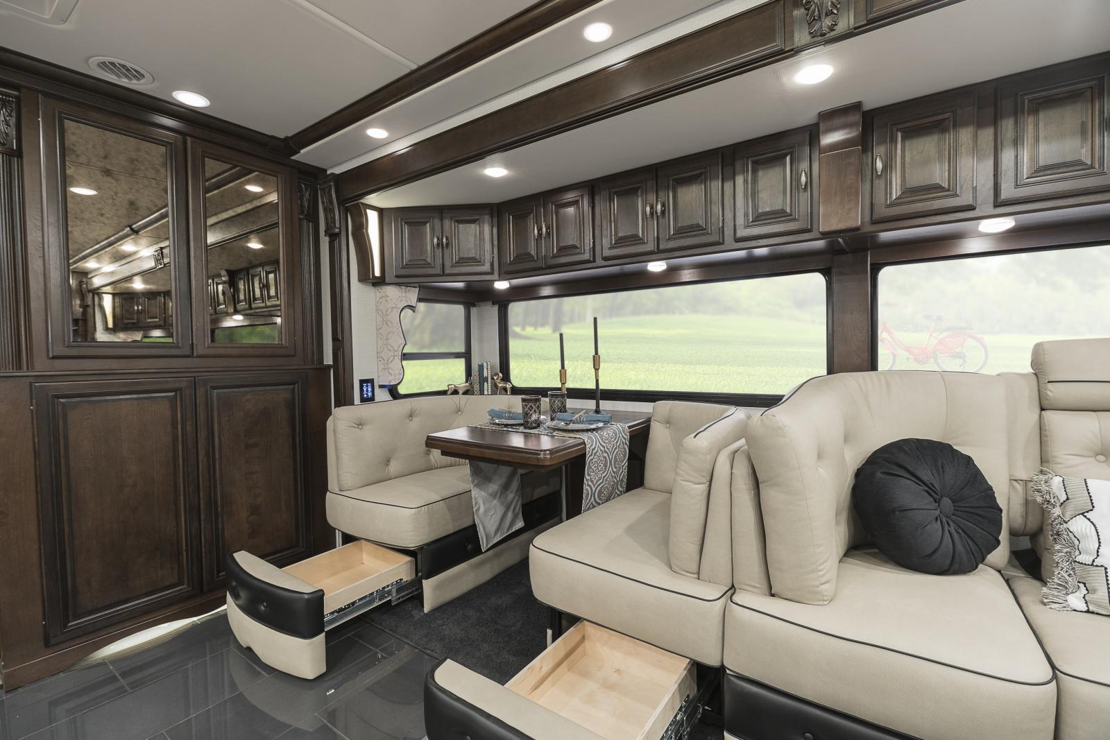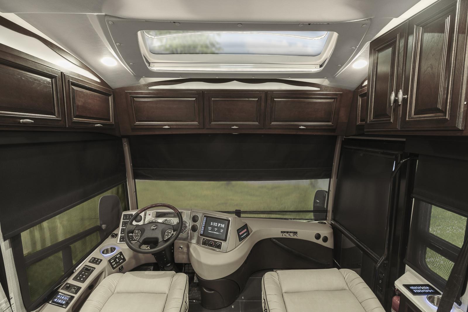 När det blir dags att sova fälls gardinerna ner elektriskt i hela bilen.