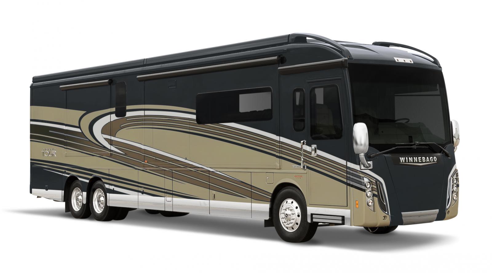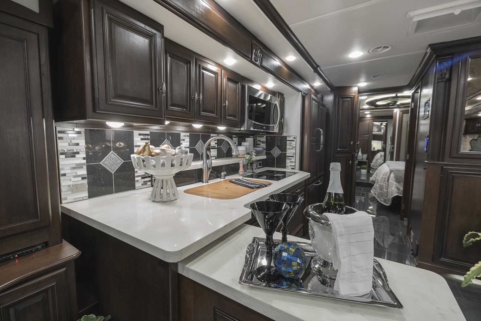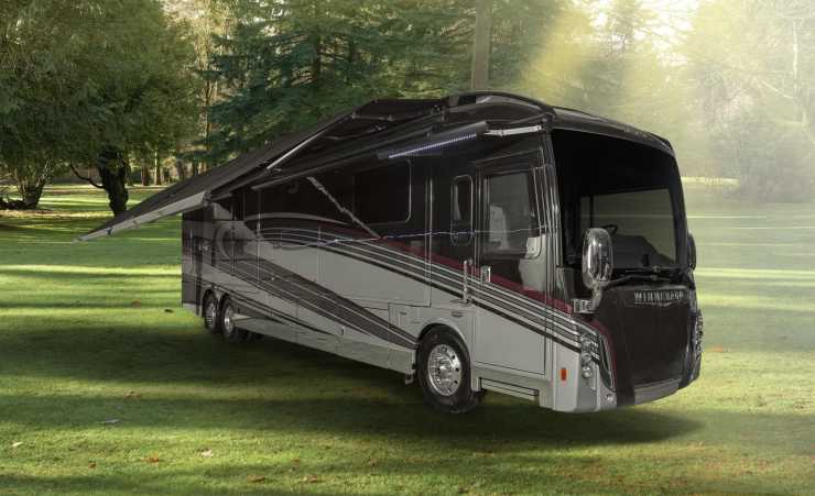 Utvändigt finns förutom stora, elektriskt utfällbara markiser på båda sidorna, även en utfällbar tv och utekök med grill.