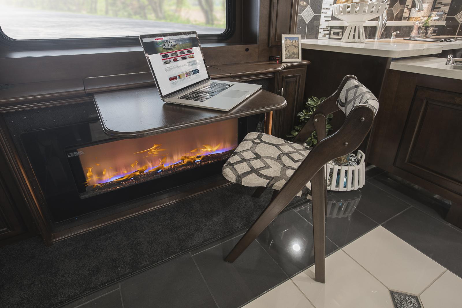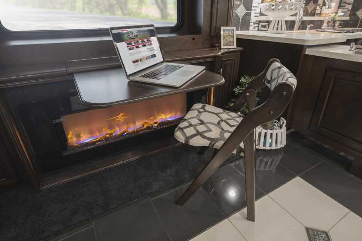 Utfällbart kontorsbord, ett bra ställe att sitta och värma fötterna på, tur att det bara är en elektrisk låtsaseld.