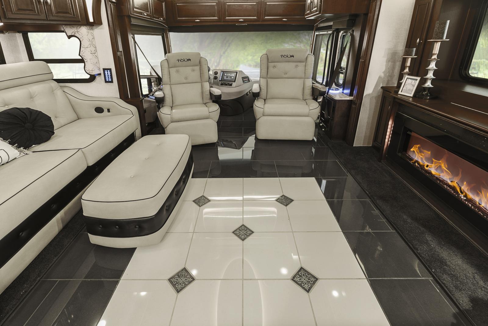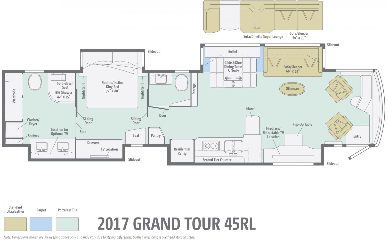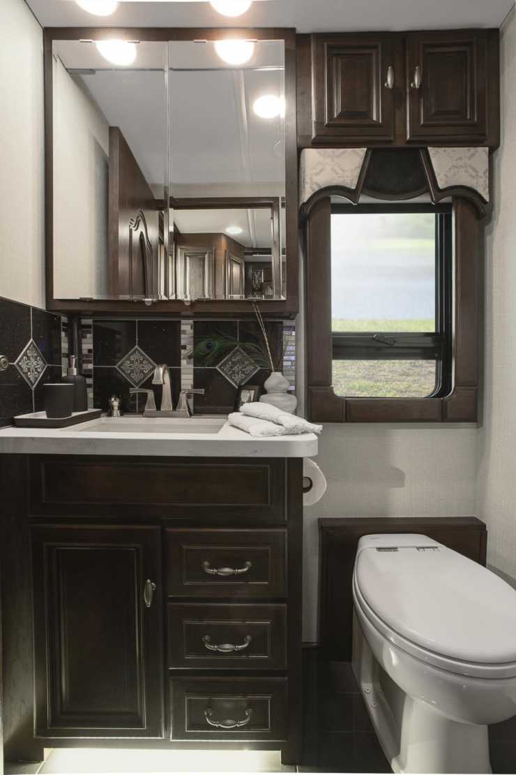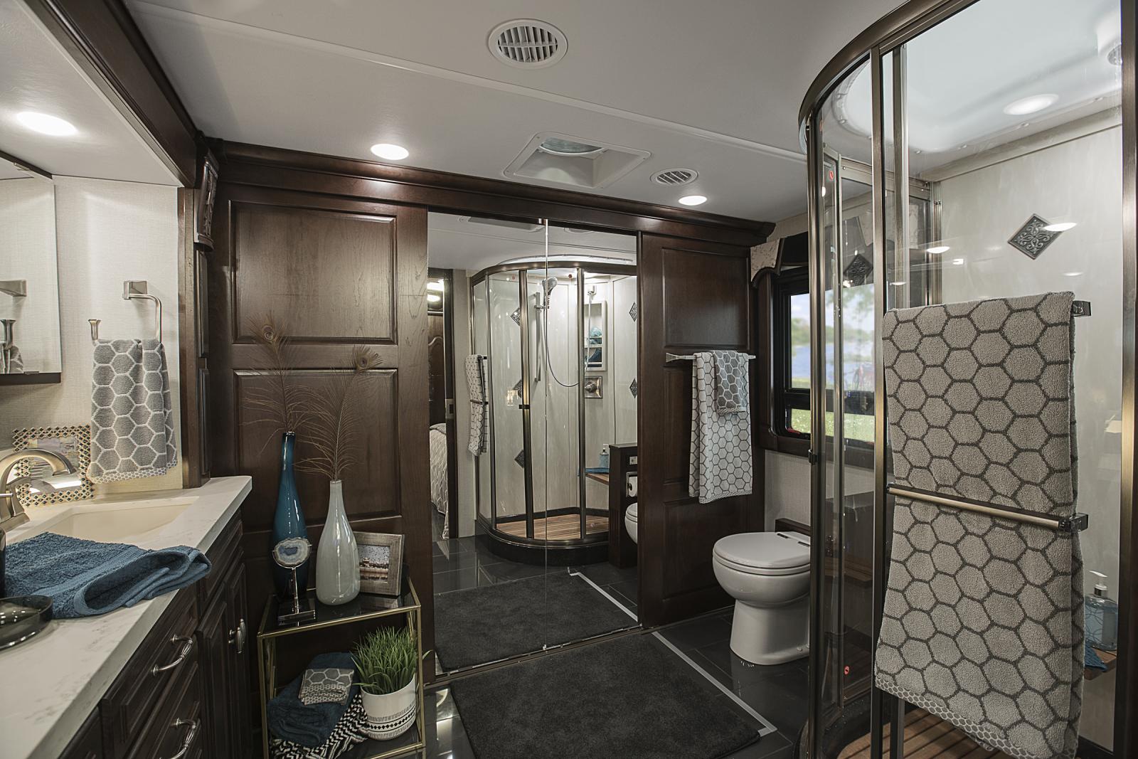 Planlösningen, liten gästtoalett nära köket och stort badrum med dubbla handfat längst bak i bilen. Det finns två sofflösningar att välja mellan.