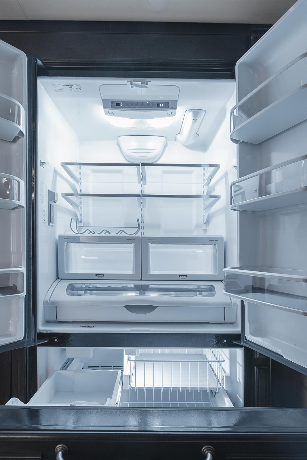 Mycket stort kylskåp med dubbla dörrar och utdragbar frysdel i botten.