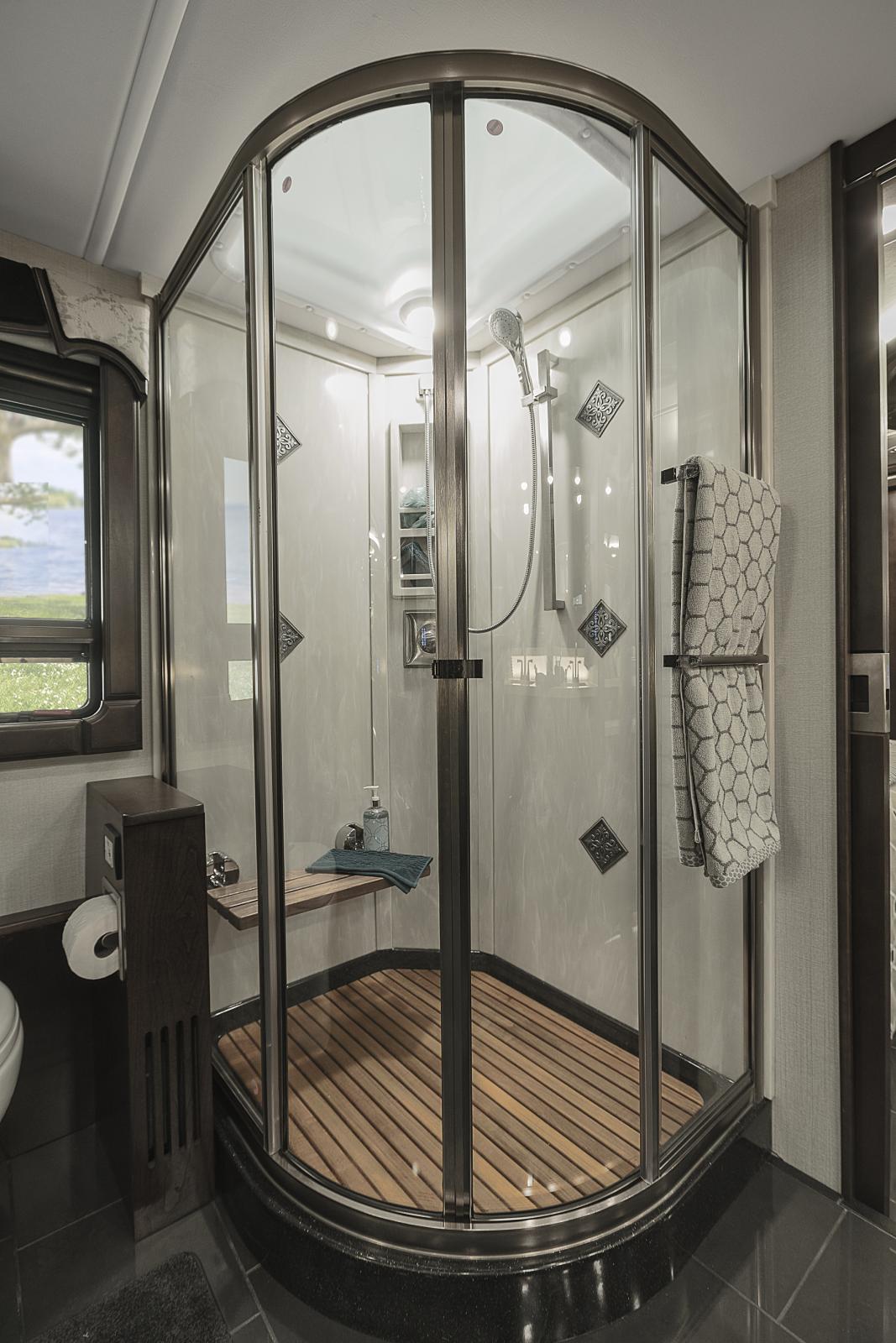 Duschkabinen är rymlig och har en utfällbar sittplats.